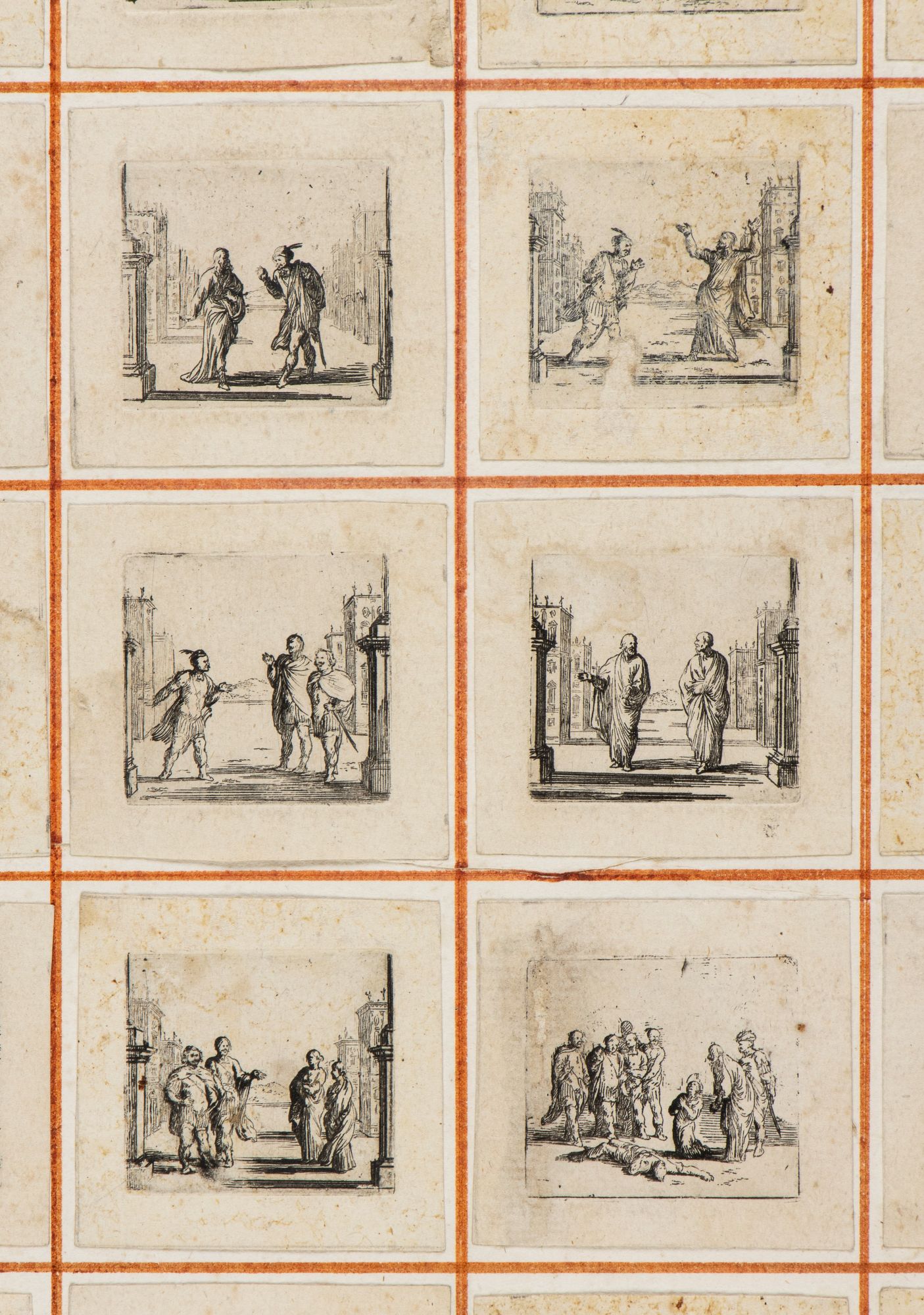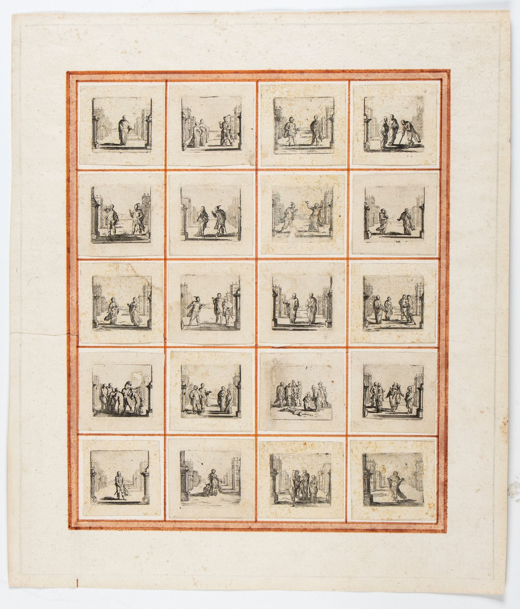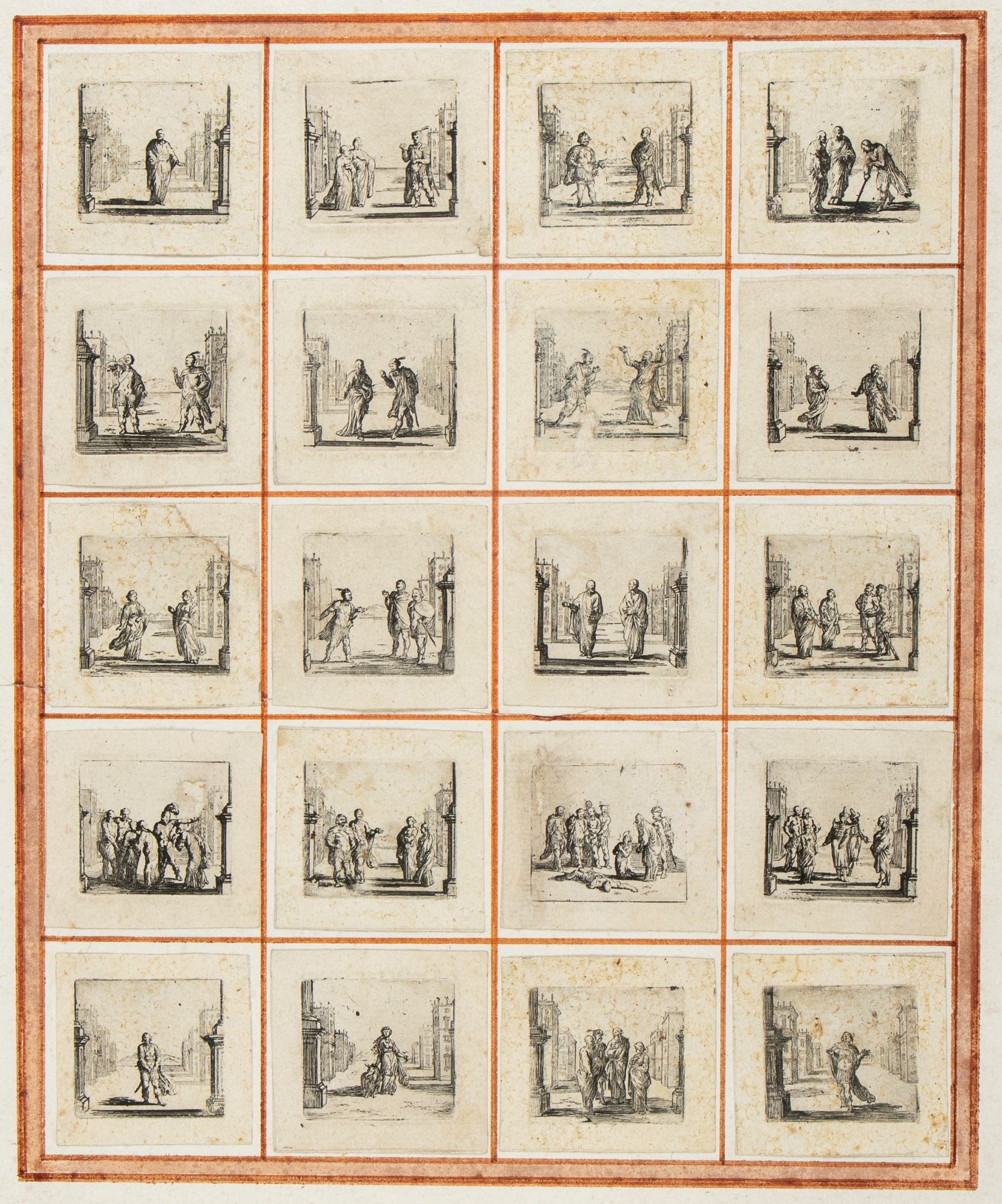 Lotto di 20 incisioni di anonimo artista della scuola fiorentina del XVII secolo. Acquaforte, 40 x 40 mm ca. (cad. lastra), 55 x 60 mm (cad. foglio).