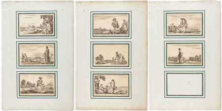 Lotto di otto incisioni. Acquaforte, 95 x 169 mm circa ciascuna. Belle impressioni su carta vergata sottile, applicate su un montaggio antico. In buone condizioni generali.