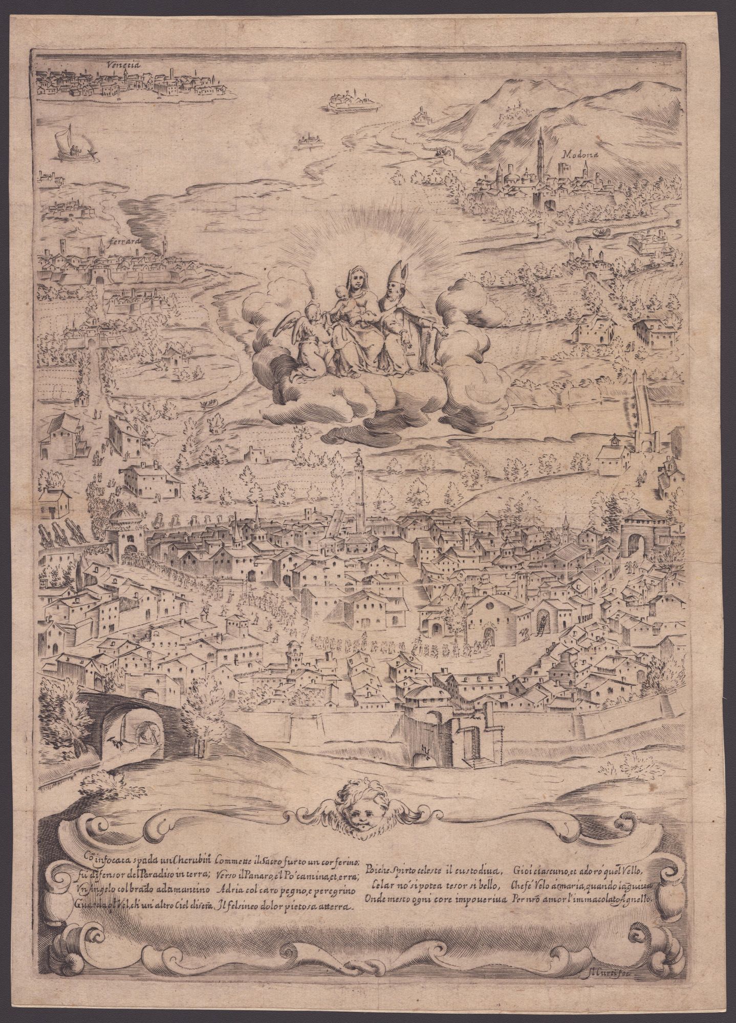 Acquaforte, 342 x 214 mm (lastra), 363 x 261 mm (foglio). Veduta di Bologna con la Madonna, Gesù e San Petronio seduti su una nuvola, circondati dalle città di Modena, Ferrara e Venezia. Firmata: F. Curti fec. Non in Le Blanc.