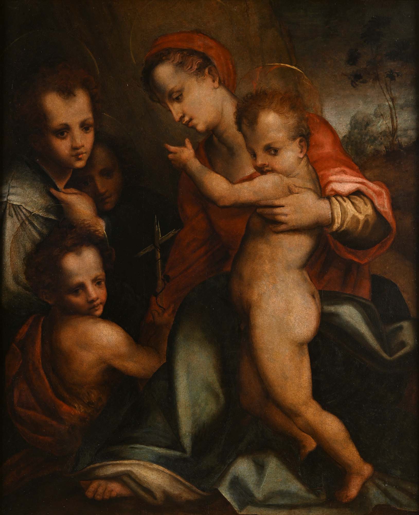 Scuola fiorentina del XVI secolo Madonna con San Giovanni Battista derivazione da un dipinto di Andrea Del Sarto olio su tavola cm 87x67 - con cornice cm 157x126
