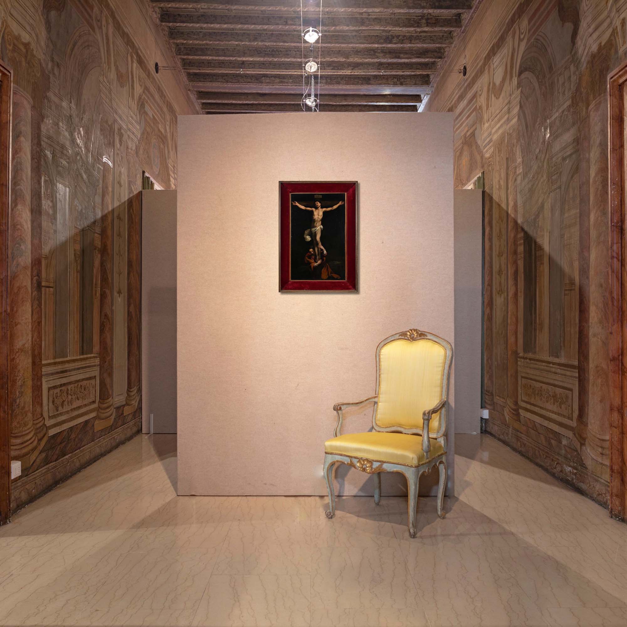 Pittore del XVIII secolo Cristo in croce con la Maddalena olio su tavola cm 73x44 con cornice cm 87x61