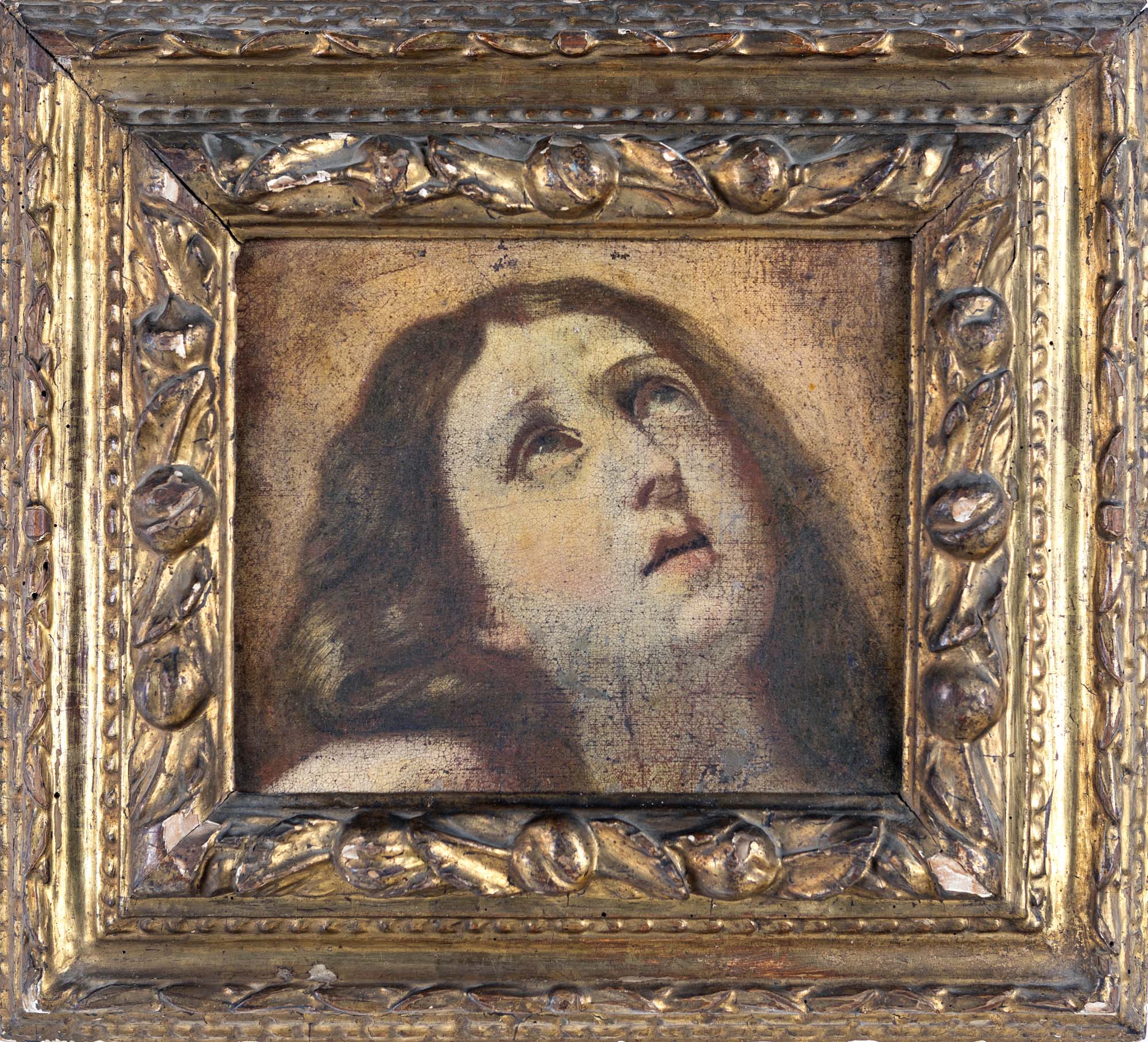 Scuola bolognese del XVIII secolo Testa di Santa in estasi Olio su tela Cm 27x32 Con cornice 46x51 cm