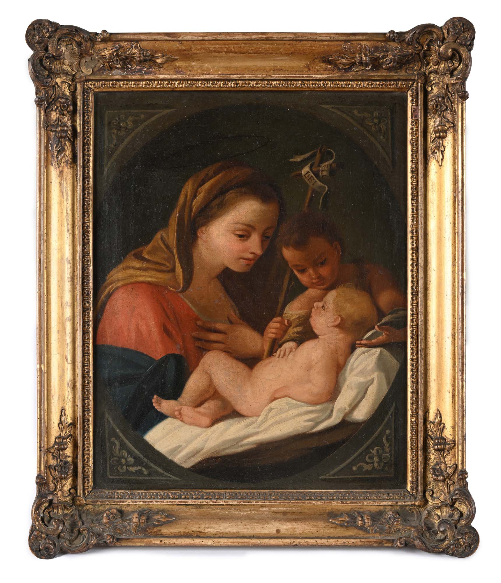 Scuola Romana del XVIII secolo Madonna con Bambino e San Giovannino Olio su tela cm 33x26 - in cornice cm 41x35