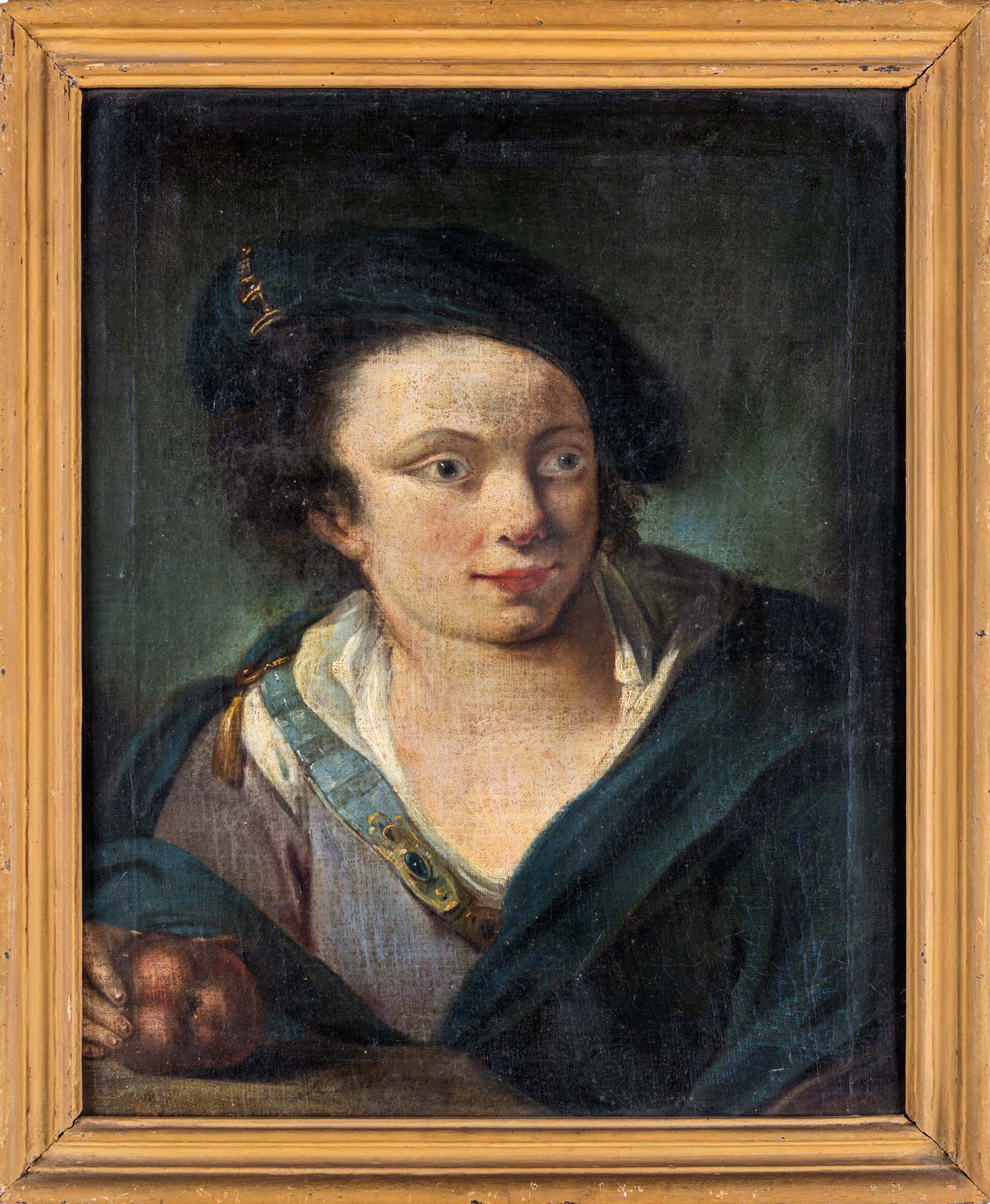 Giuseppe Nogari (scuola di) Venezia 1699-Venezia 1763 Ritratto di gentiluomo con mela Olio su tela Cm 53x43 - Con cornice 61x51 cm