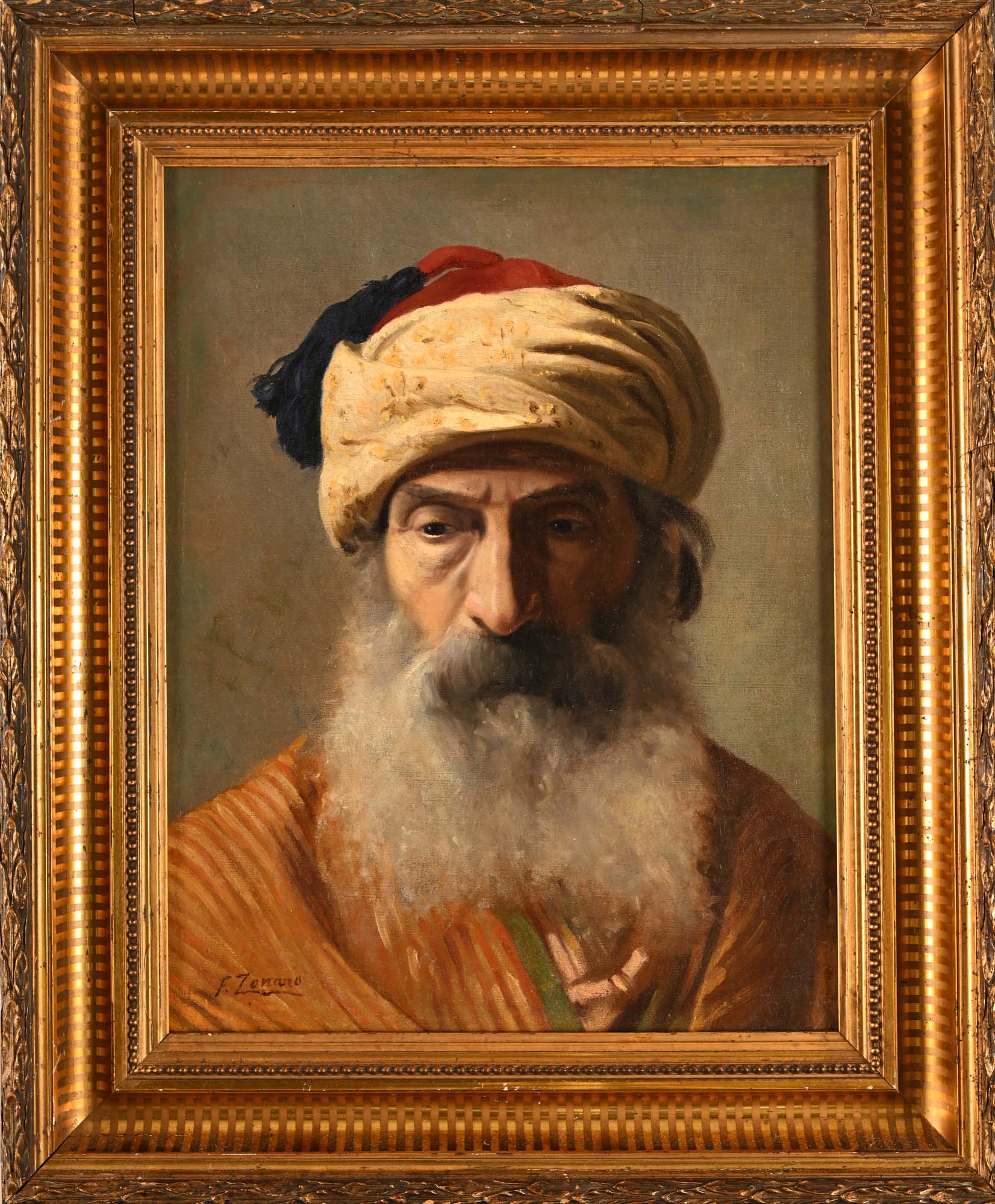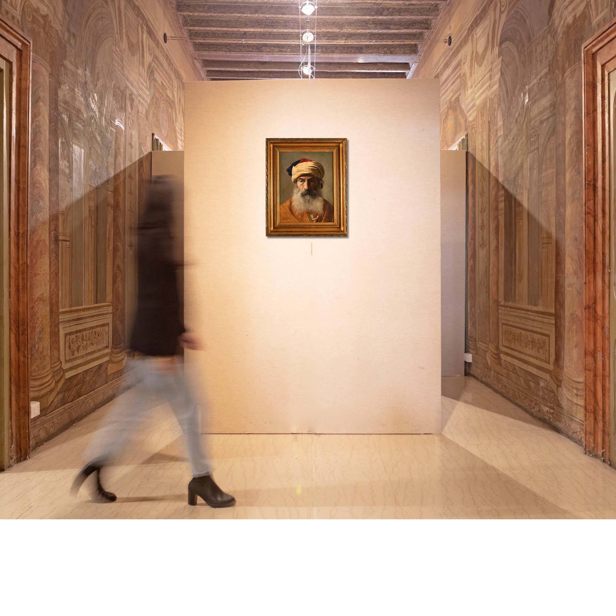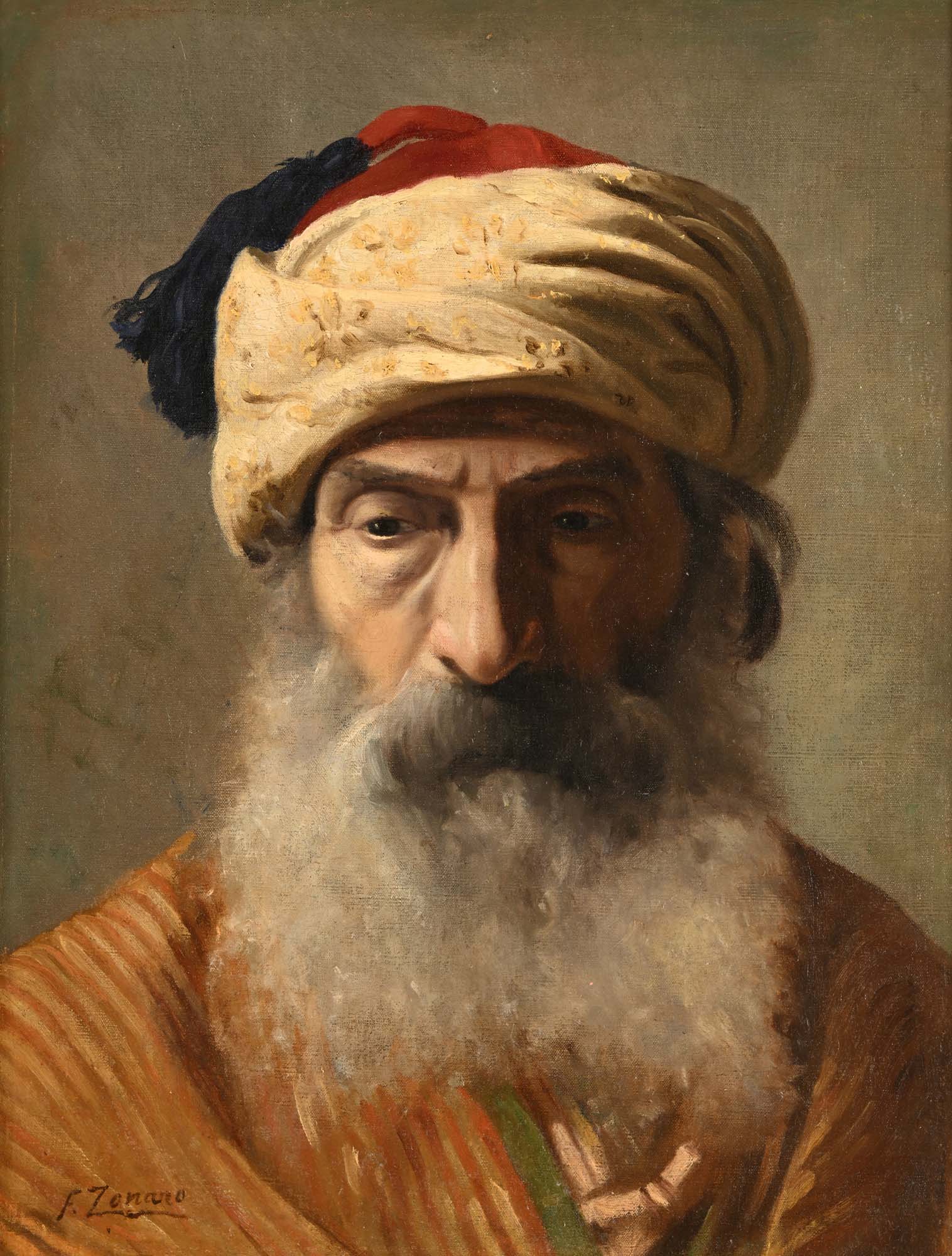 Trasferitosi a Istanbul nel 1891, Fausto Zonaro nel 1896 diviene pittore di corte del sultano Abdülhamid II e per un ventennio descrive e documenta tradizione e modernità della Turchia a cavallo tra Ottocento e Novecento. A questa fortunata stagione è ascrivibile questo intenso ritratto in costume con il tradizionale copricapo turco.