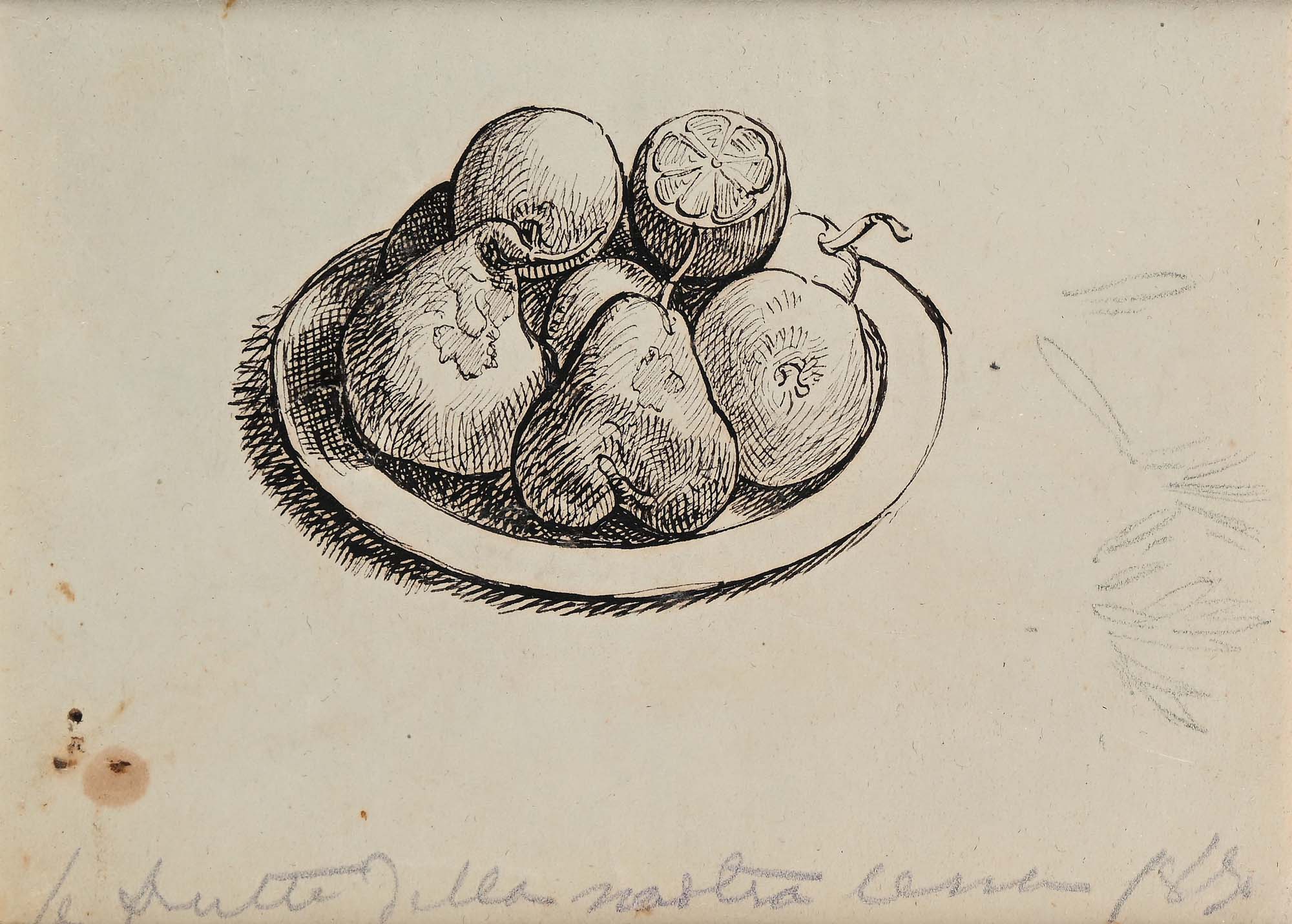 Giovanni (Nino) Costa Roma 1826-Marina Di Pisa 1903 La frutta della nostra cena; al verso Paesaggio Titolato e datato in basso: "la frutta della nostra cena 1870" inchiostro su carta cm 9,5x13 - in cornice cm 25,5x30 1870