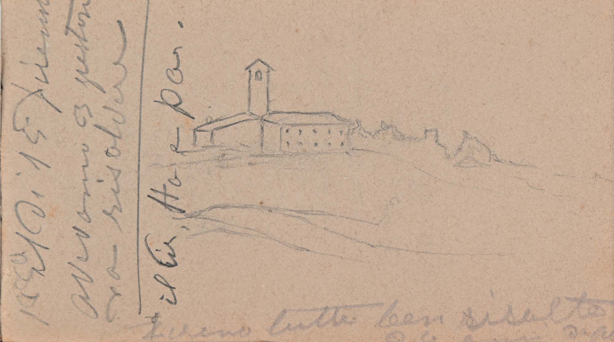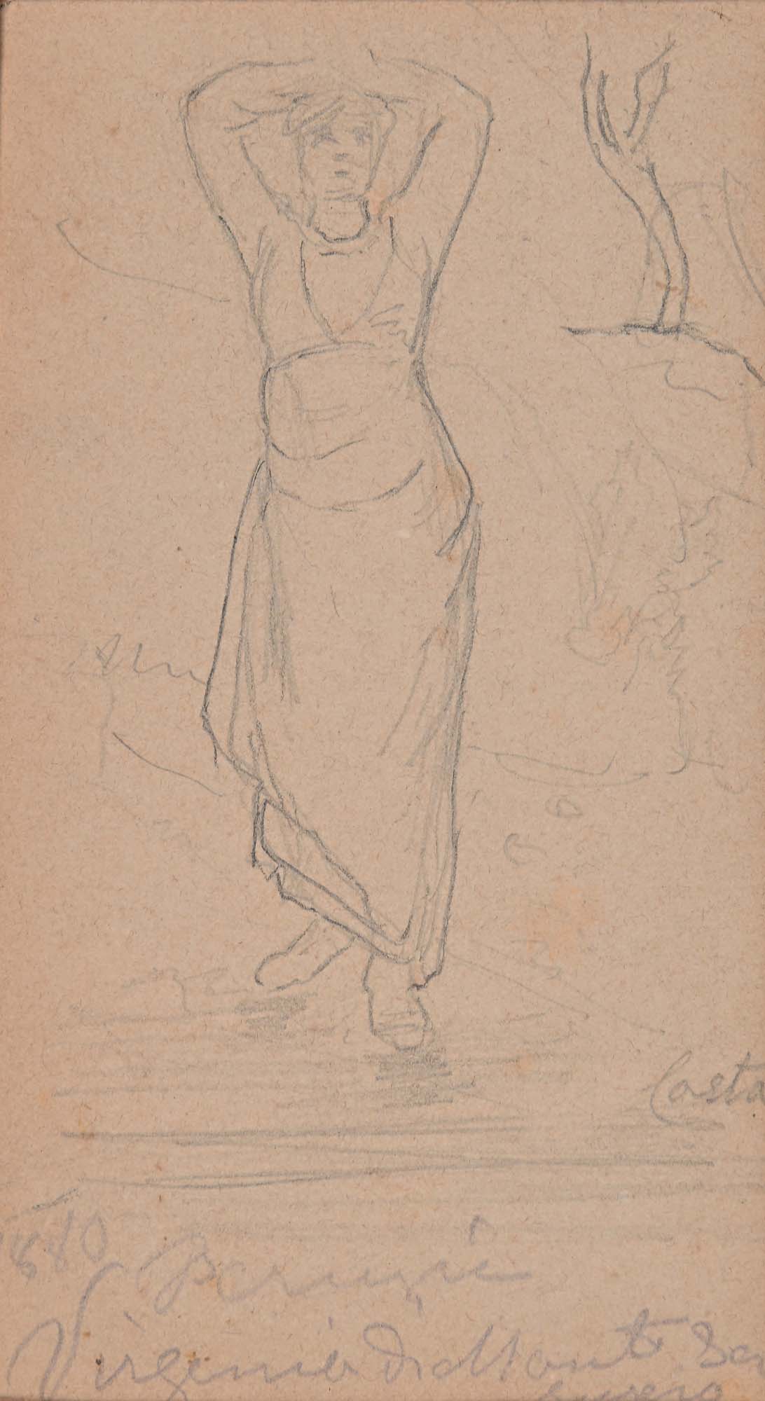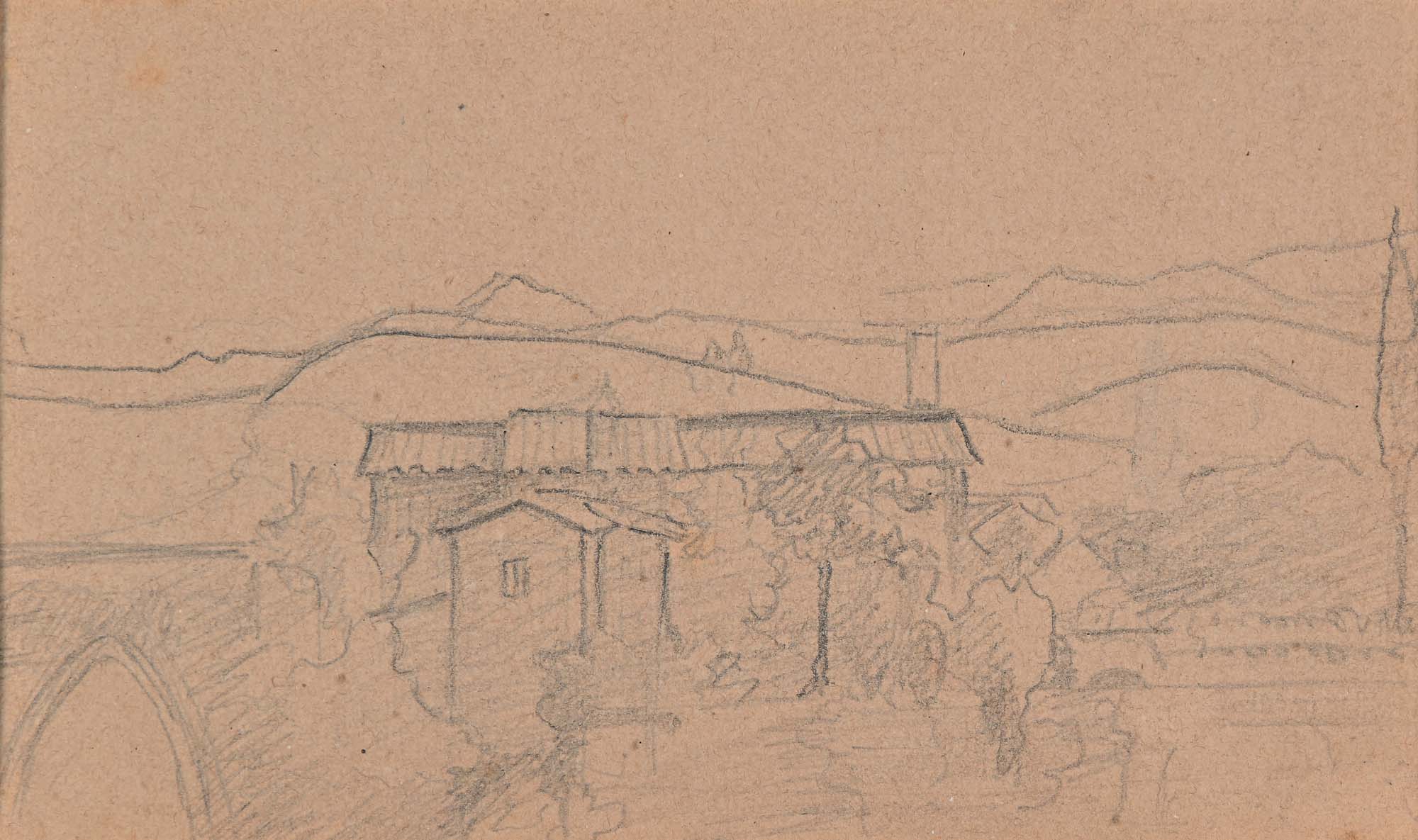 Giovanni (Nino) Costa Roma 1826-Marina Di Pisa 1903 Taccuino di 22 fogli Il Taccuino, relativo a un soggiorno tra Umbria e Marche, reca disegni e pensieri sparsi, l'indirizzo "Lemmo Rossi Scotti via Riaria Palazzo Baglioni Perugia" e le iscrizioni "1880 il di 15 dicembre avevamo 3 questioni da risolvere" e Urbino, S. Angelo, Borgo S. Sepolcro, Città di Castello". matita su carta bruna cm 7,8x13,6 1880 circa