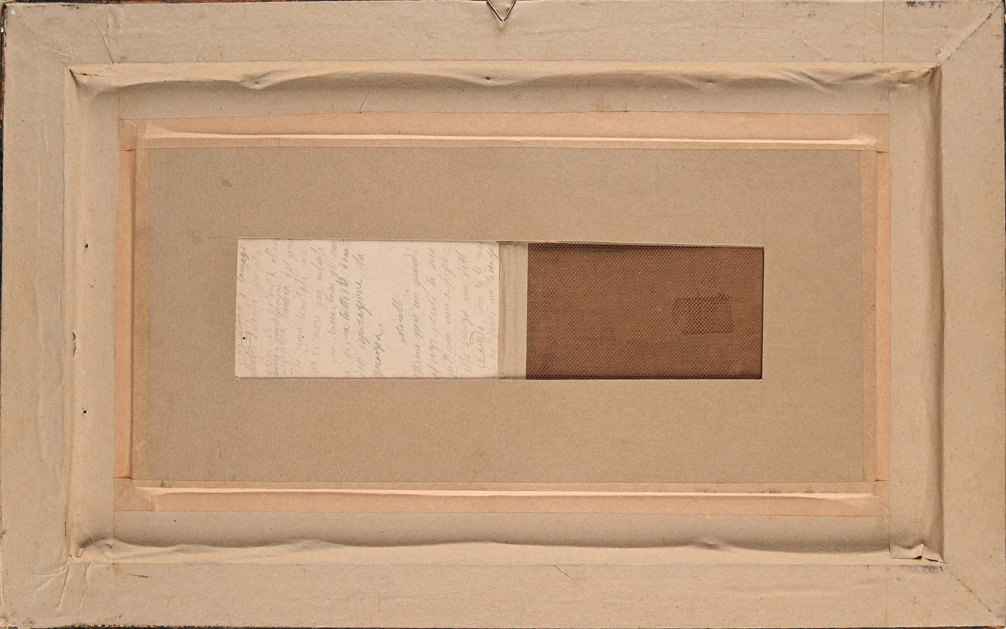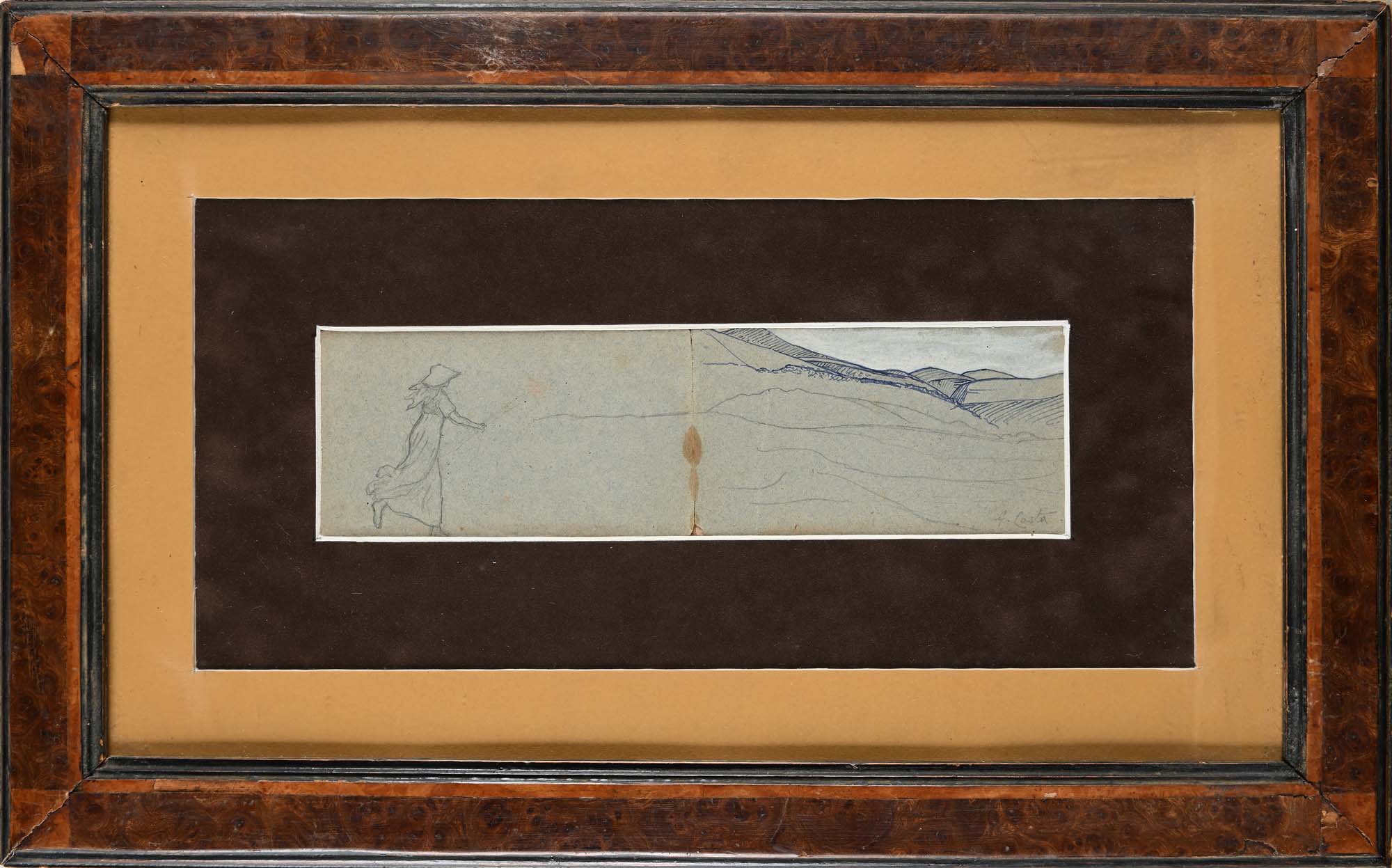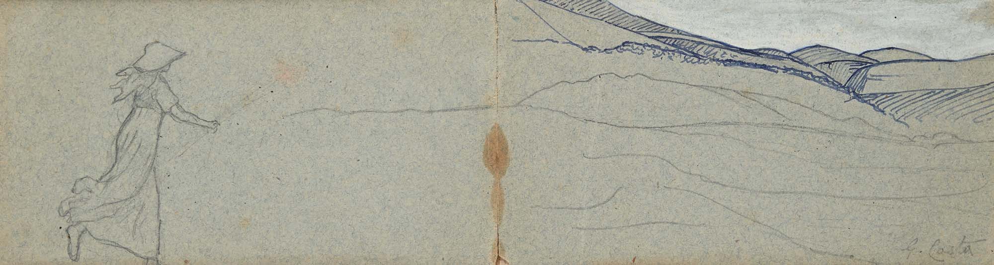 Giovanni (Nino) Costa Roma 1826-Marina Di Pisa 1903 Paesaggio con fanciulla Firmato in basso a destra "G. Costa" matita e inchiostro su carta applicata su cartone cm 8x27,5 - in cornice cm 31,5x51