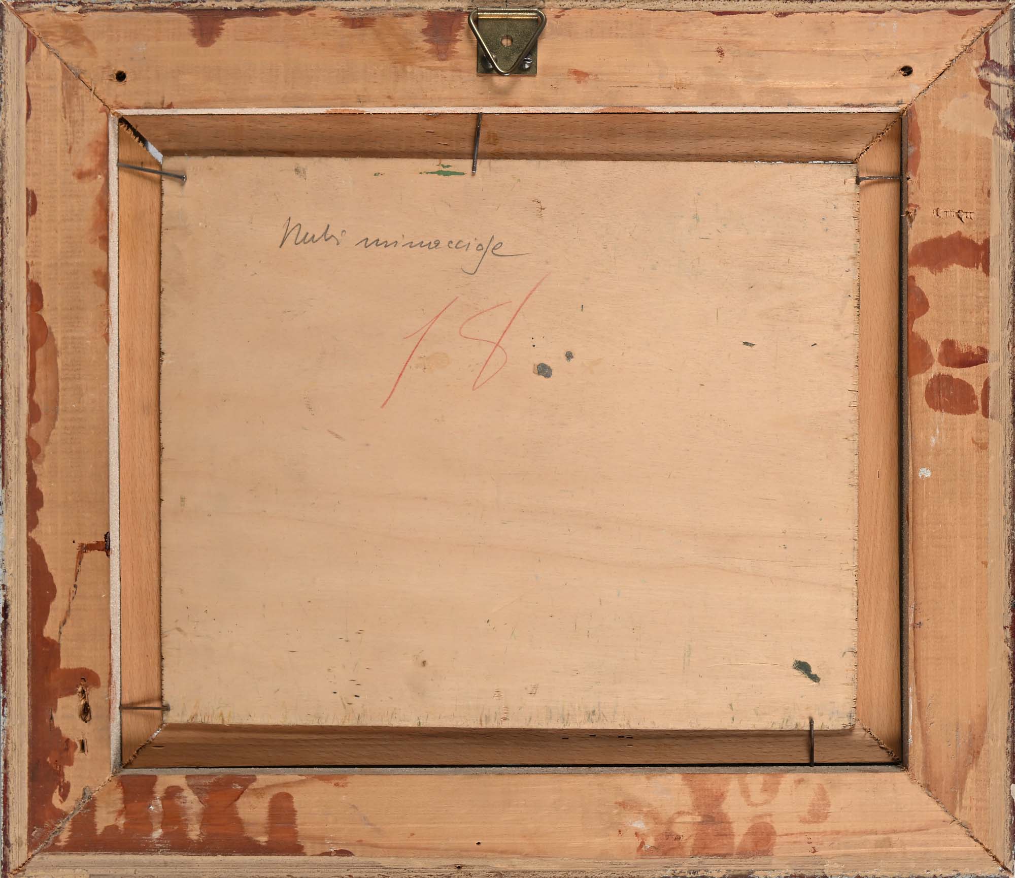 Don Angelo Rescalli Azzanello 1884-Susa 1956 Nubi minacciose Firmato in basso a destra "Don Rascalli"; titolato sul retro olio su tavola cm 22x27 - in cornice 34x39