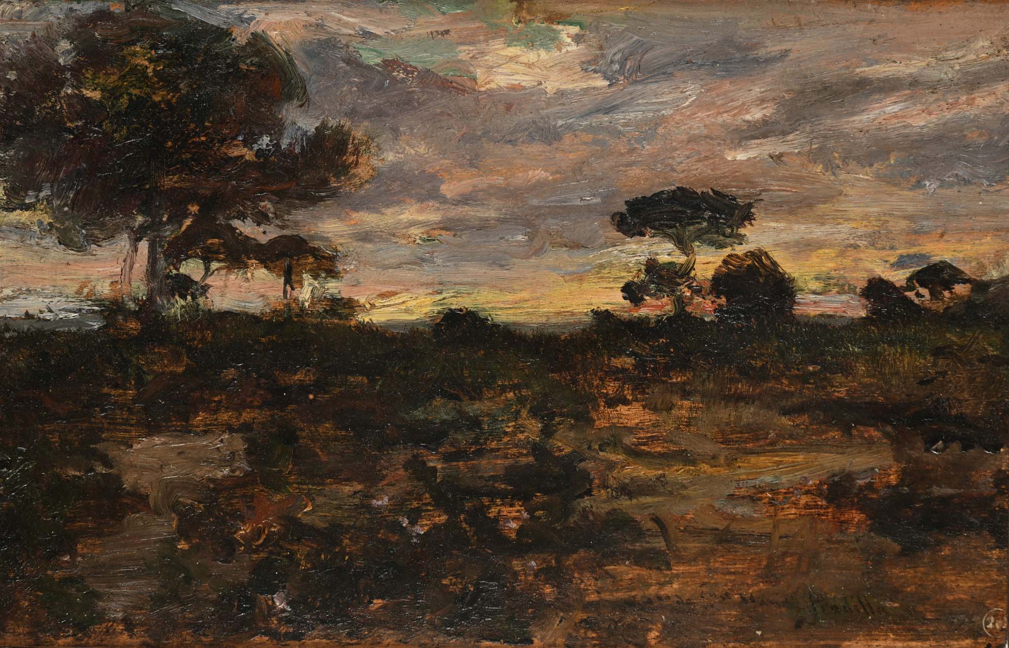 Francisco Pradilla Ortiz Villanueva de Gállego 1848-Madrid 1921 Paesaggio Firmato in basso a destra "Pradilla" olio su tavola cm 17x27 - in cornice cm 36,5x46