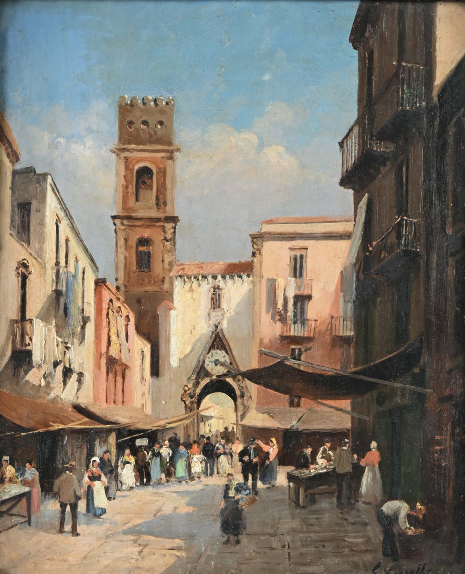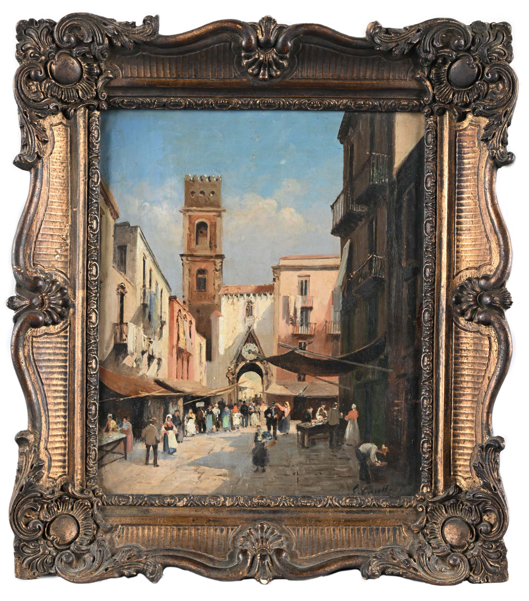Giuseppe Carelli 1858-1921 Napoli - Il campanile e l'orologio di Sant'Eligio Maggiore Firmato in basso a destra "G. Carelli" olio su tavola cm 30x25 - in cornice cm 40x35