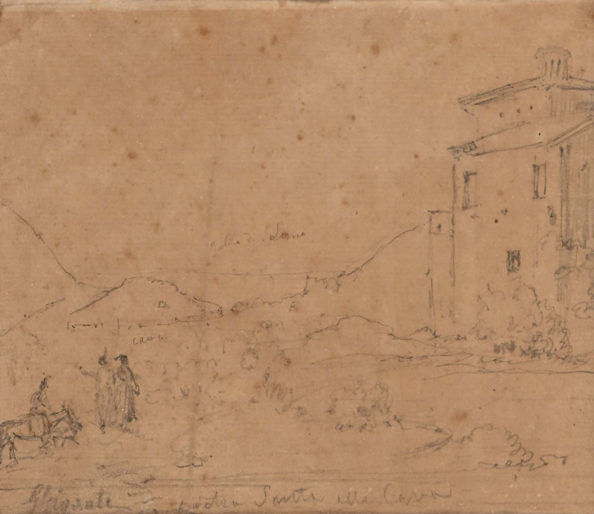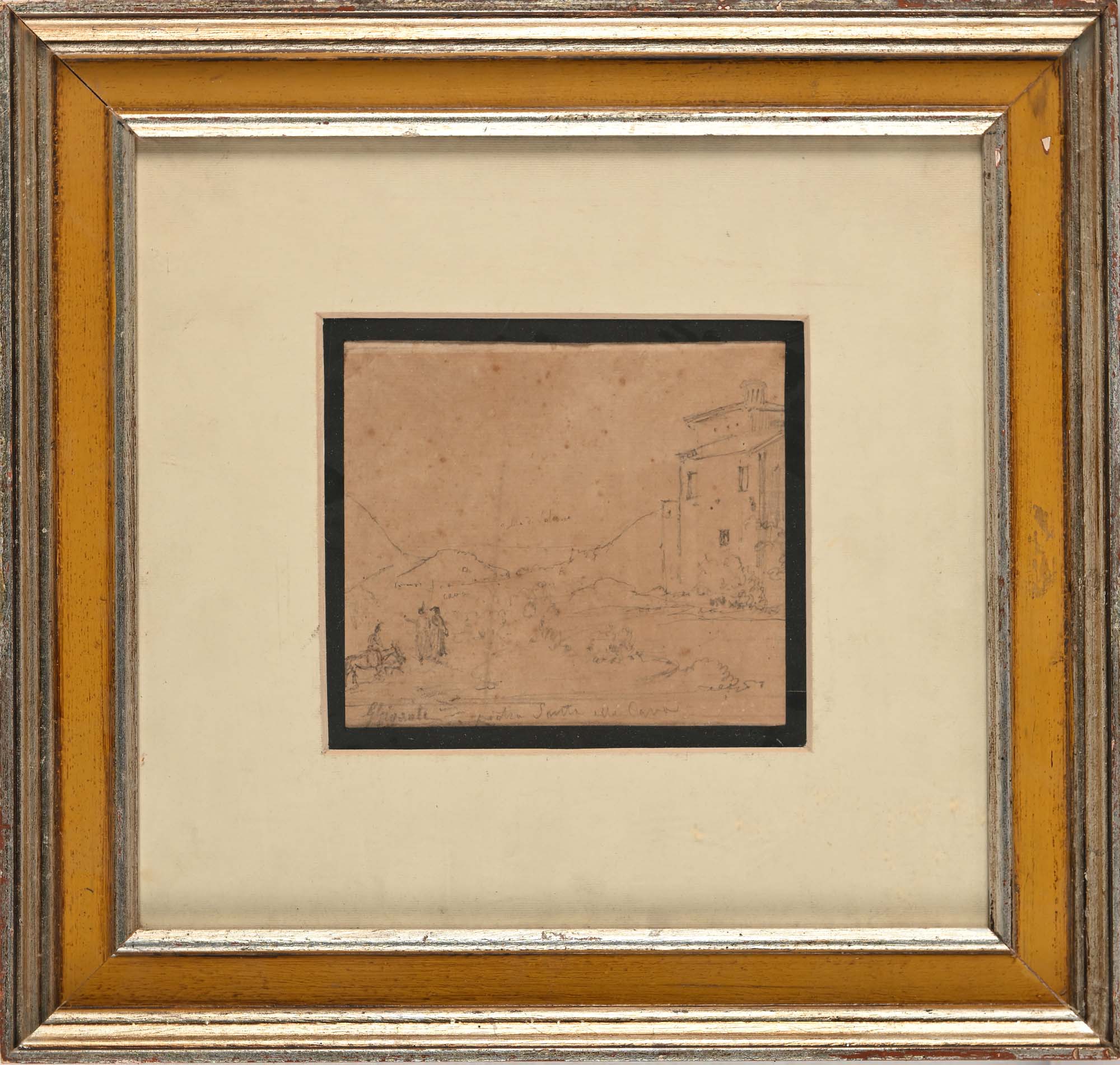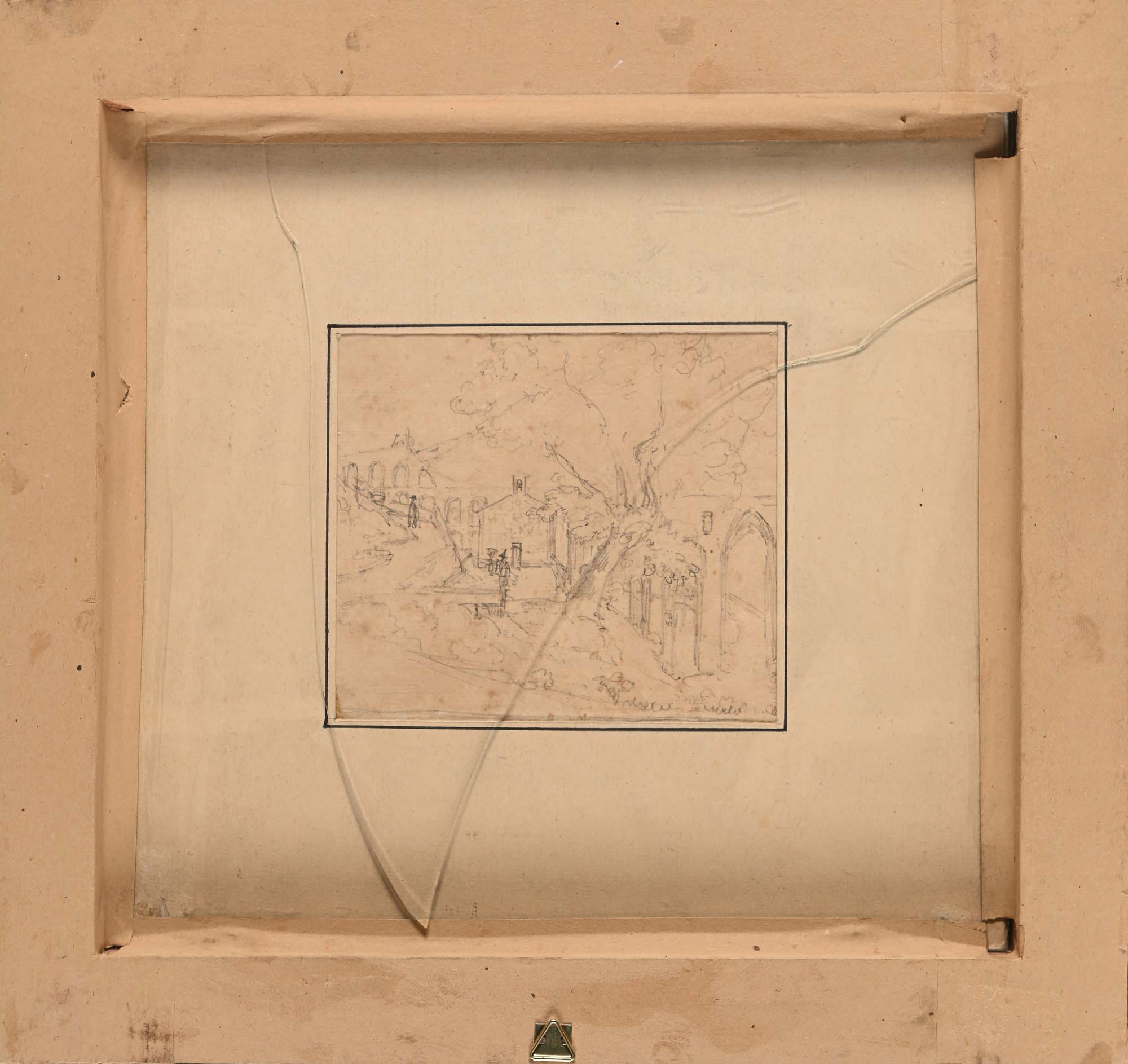 Giacinto Gigante Napoli 1806-Napoli 1876 Paesaggio con figure; al verso studio di architetture Firmato in basso a sinistra "Gigante"; carta filigranata "Ambrogio" matita su carta cm 14,8X13,2 - in cornice cm 35x36,5
