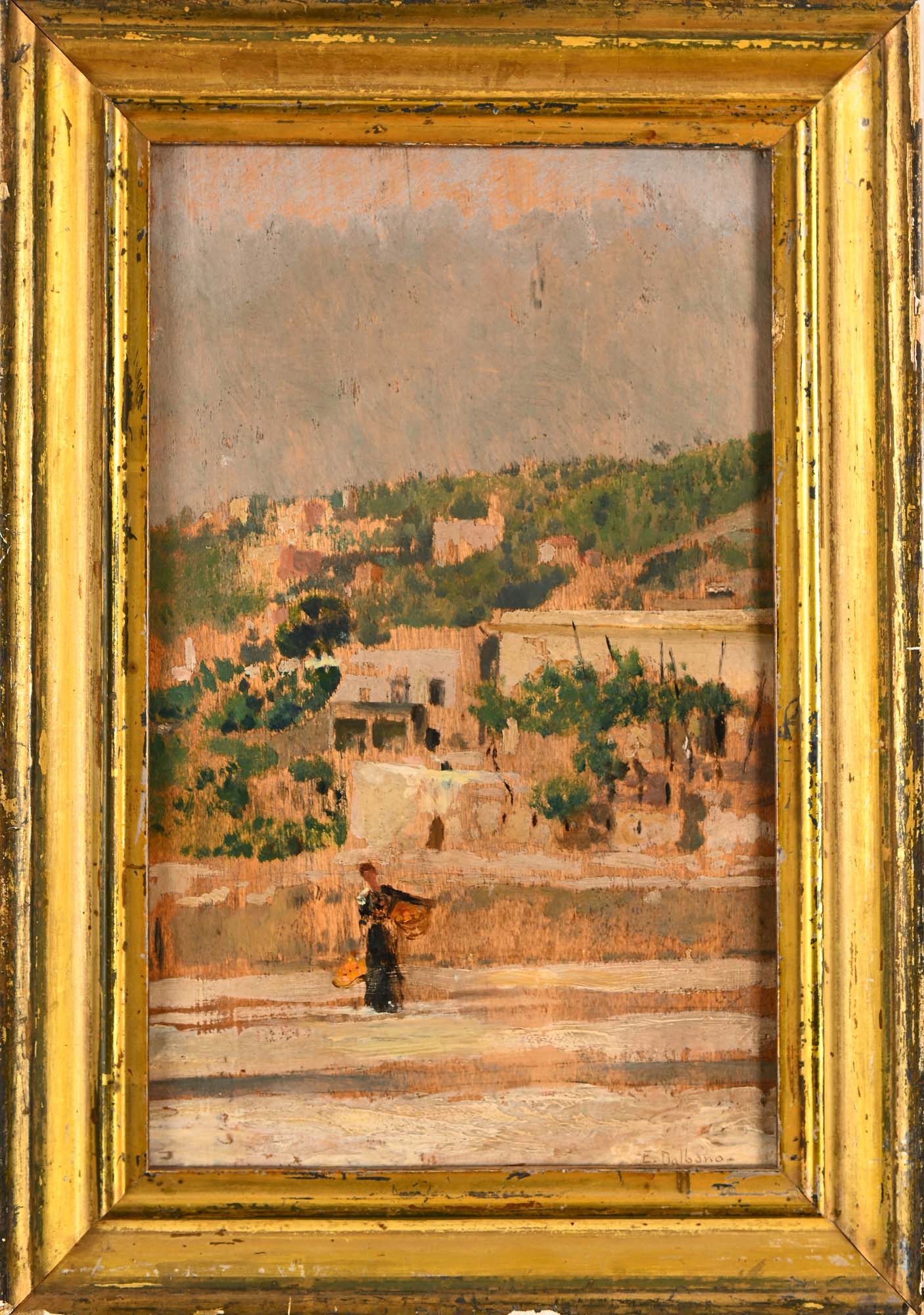 Eduardo Dalbono Napoli 1841-Napoli 1915 Paesaggio con figura Firmato in basso a destra "E. Dalbono" olio su tavola cm 32x20 - in cornice cm 39,5x27,5
