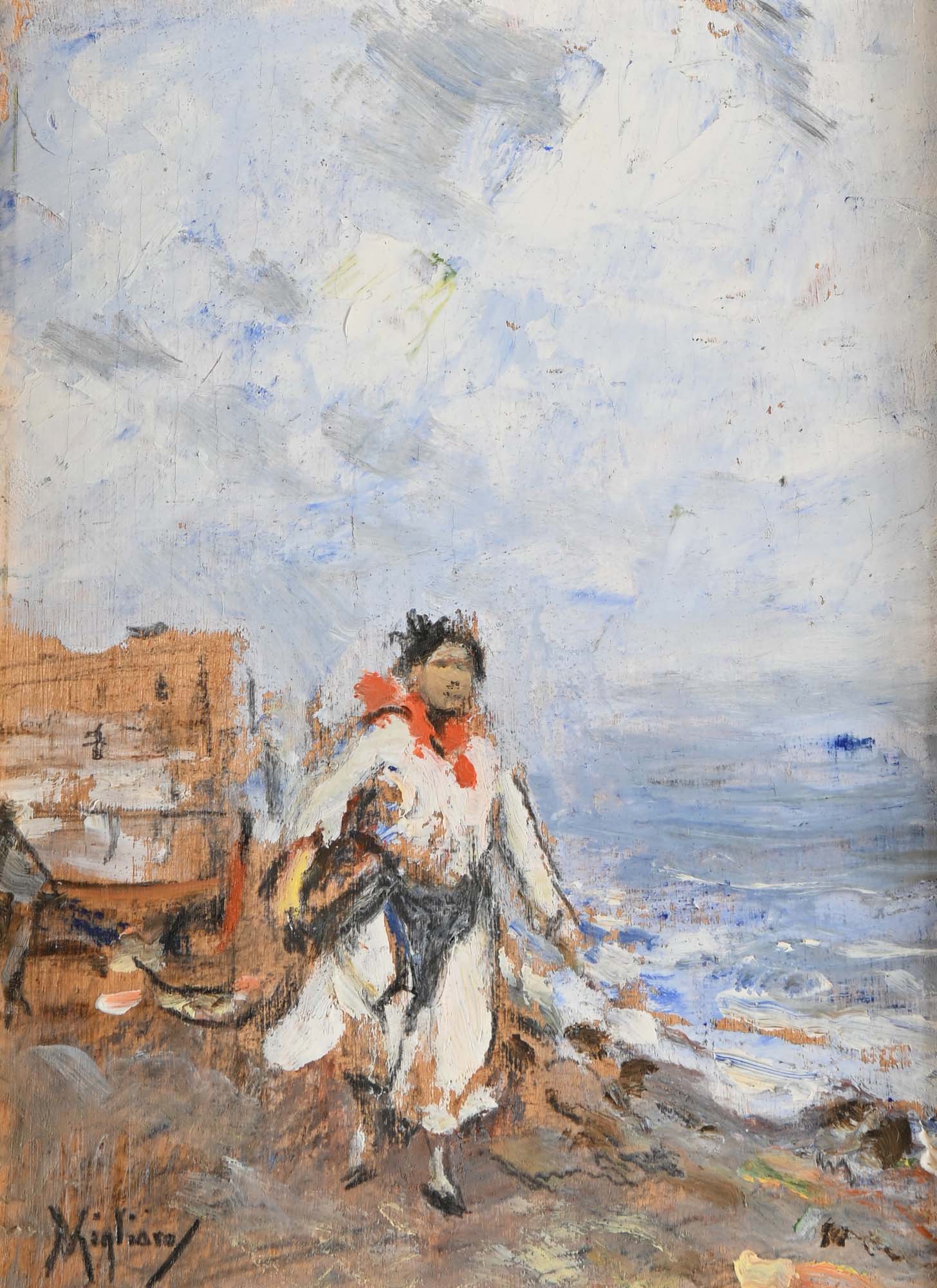Vincenzo Migliaro Napoli 1858-Napoli 1938 Figura sulla spiaggia olio su...