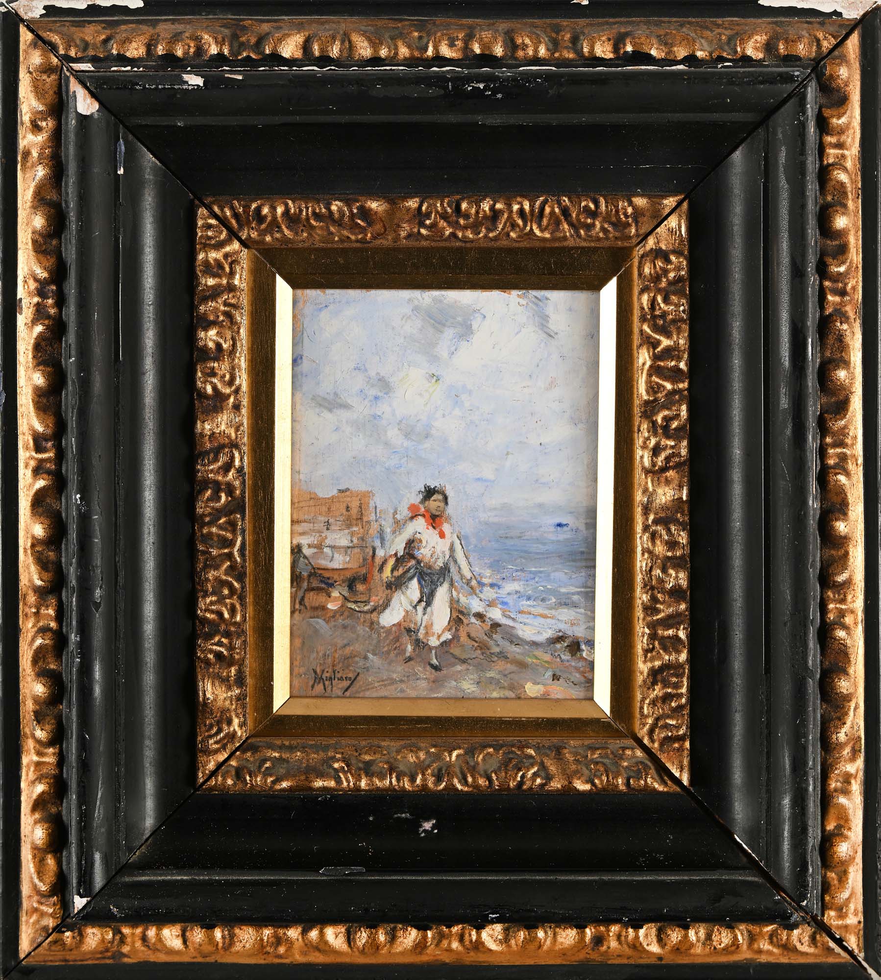 Vincenzo Migliaro Napoli 1858-Napoli 1938 Figura sulla spiaggia olio su tavola cm 13x10 - in cornice cm 29x26