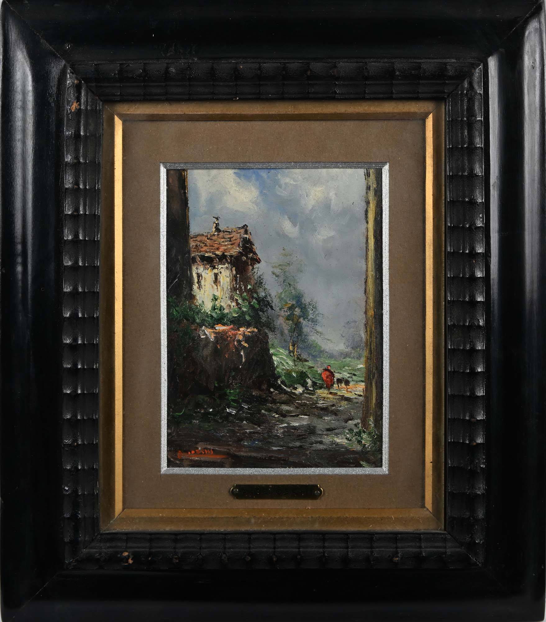 Athos Brioschi Milano 1910-Milano 2000 Paesaggio con casolare Firmato in basso a destra "A. Brioschi" olio su cartone pressato cm 18x13 - in cornice cm 38x33