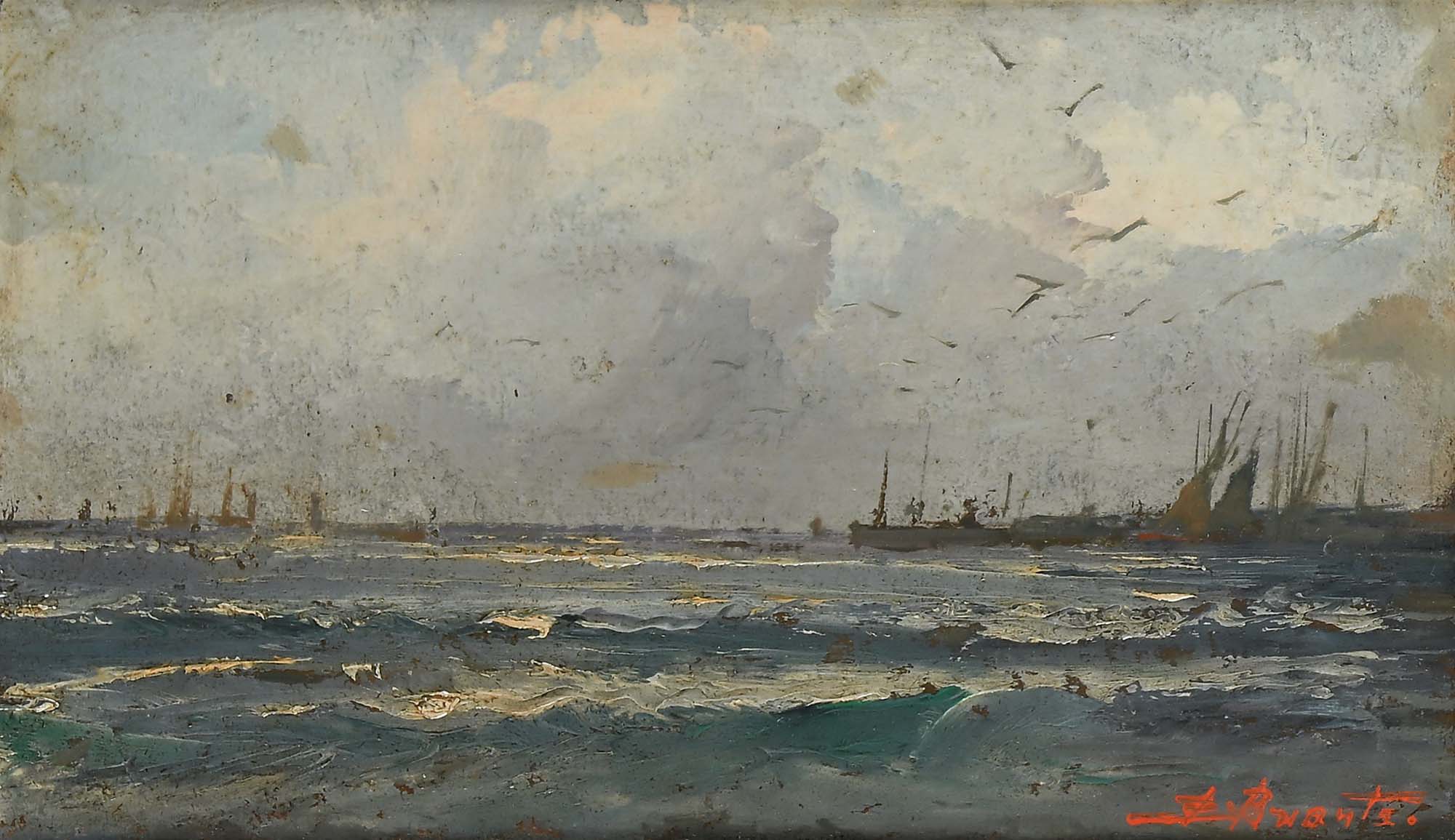 Ezelino Briante Napoli 1901-Roma 1971 Marina con velieri Firmato in basso a destra "E. Briante" olio su tavola cm 13x22 - in cornice cm 34x44