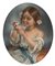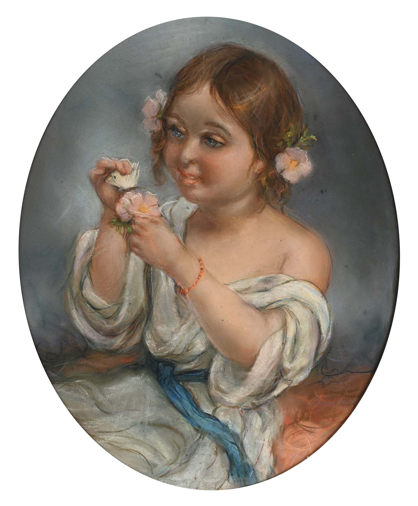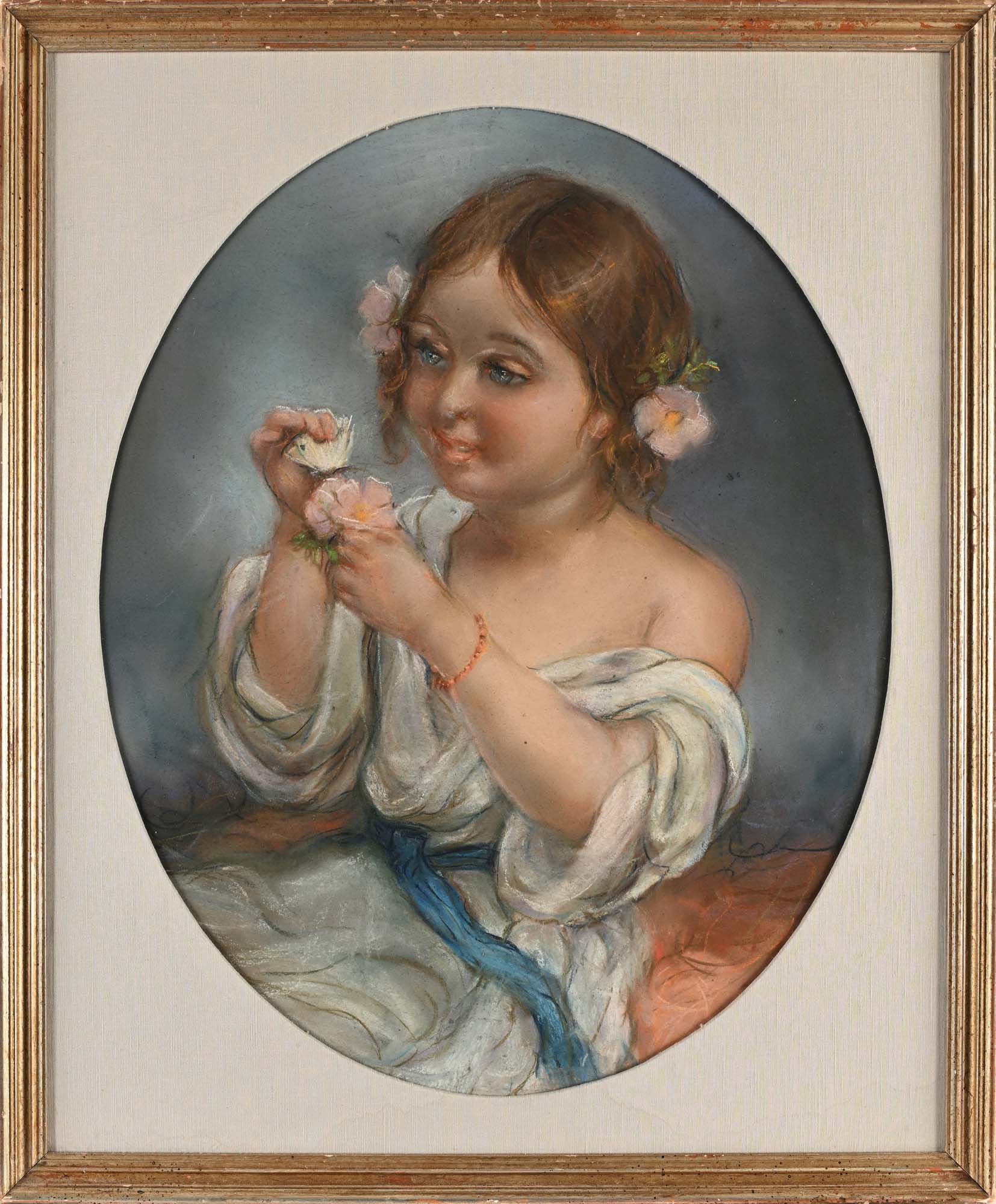 Pittore fine XIX/inizi XX secolo Bimba con fiori fra i capelli e farfalla bianca in mano pastelli su carta ovale cm 59x47 - in cornice cm 72x60