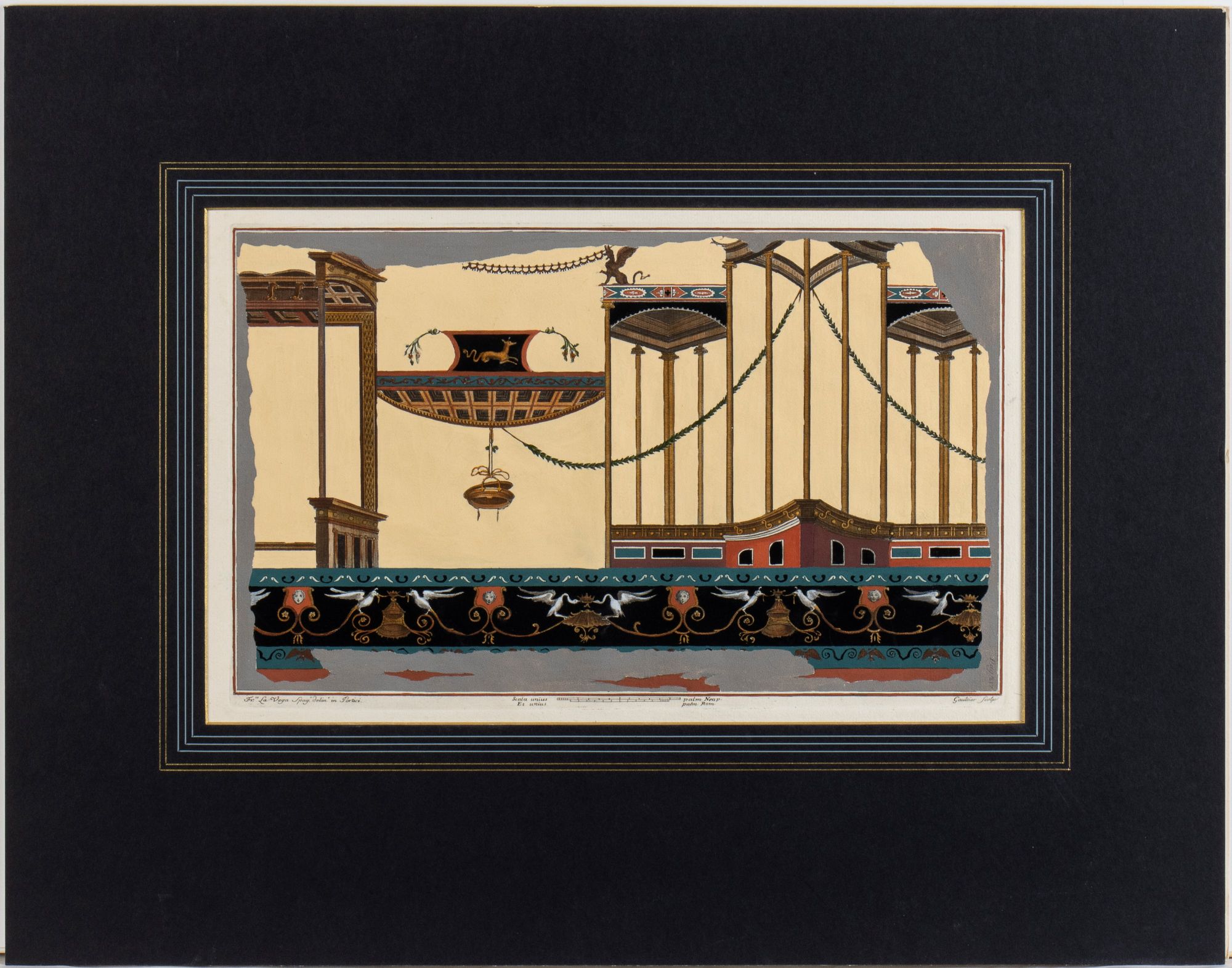 Fresca impressione con molto bella coloritura coeva. Stampa su carta vergata. Foglio in ottimo stato, applicato lungo il bordo superiore su passe-partout moderno.