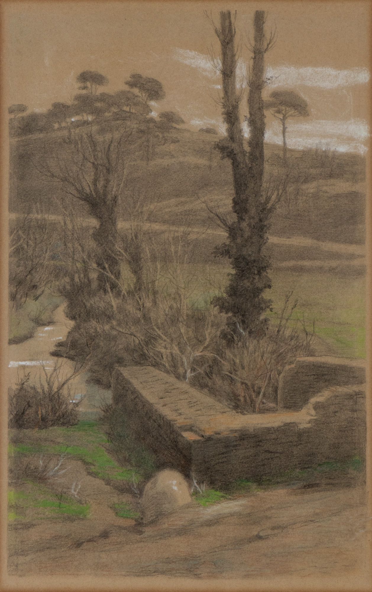 Pastello e craboncino su cartoncino, 490 x 310 mm. Al verso etichette del 5° salone Nazionale Antiquario Roma (1980) e 12° Salone Nazionale Antiquario Roma (1987). Con cornice e passe-partout (65 x 47 x 2 cm).
