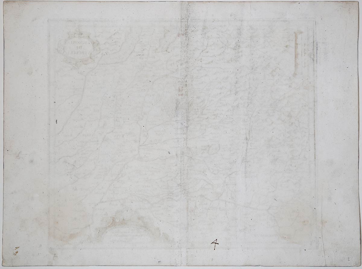 Bulino, 520 x 600 mm. Tratta da L'Italia di Fabio Magini. Due fogli di carta vergata uniti, uno con filigrana. Al verso testo in latino. Coloritura coeva. In buono stato salvo ossidazioni.