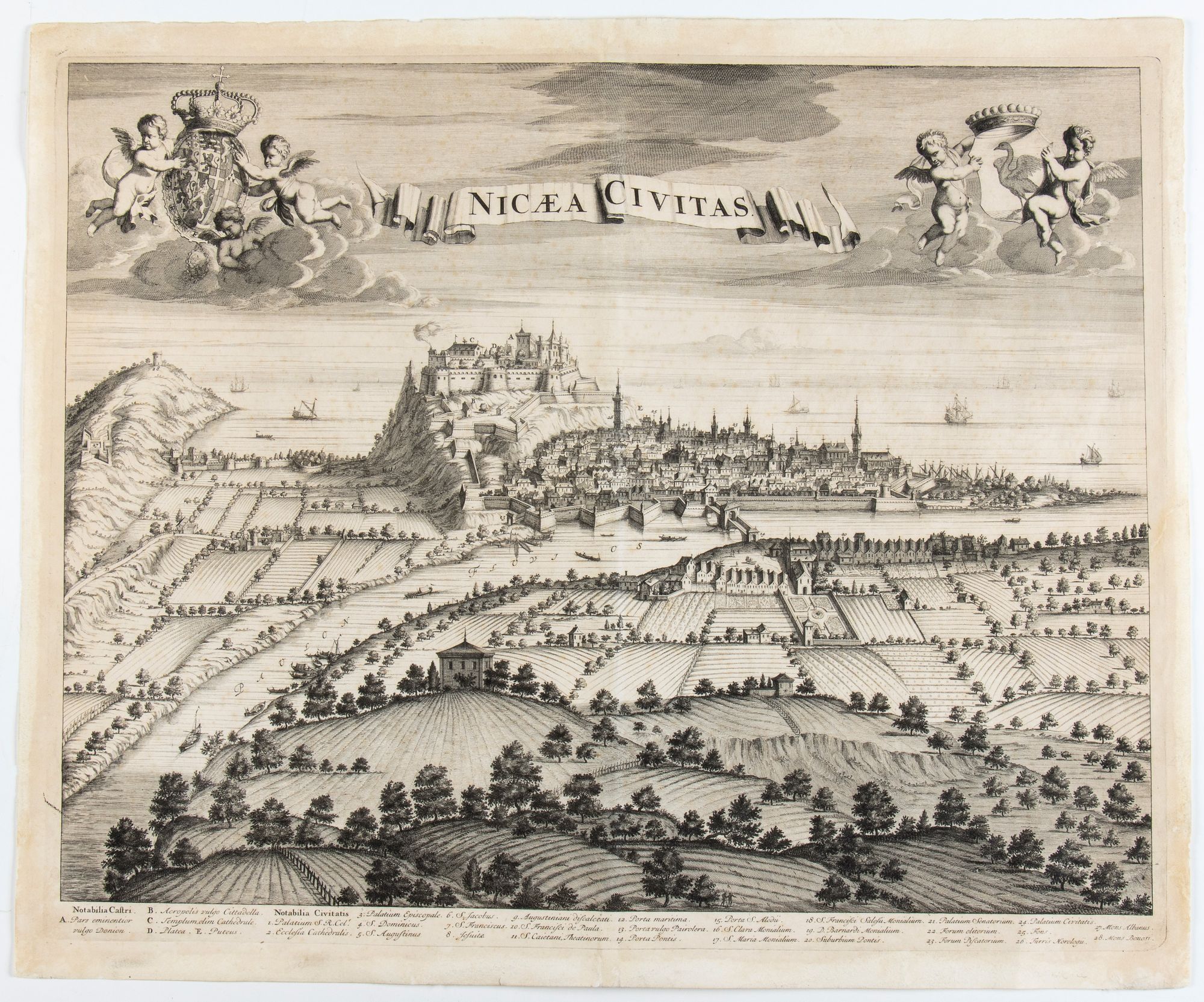 Acquaforte, 527 x 635 mm. Veduta di Nizza tratta da "Novum theatrum Pedemonti et Sabaudiae".