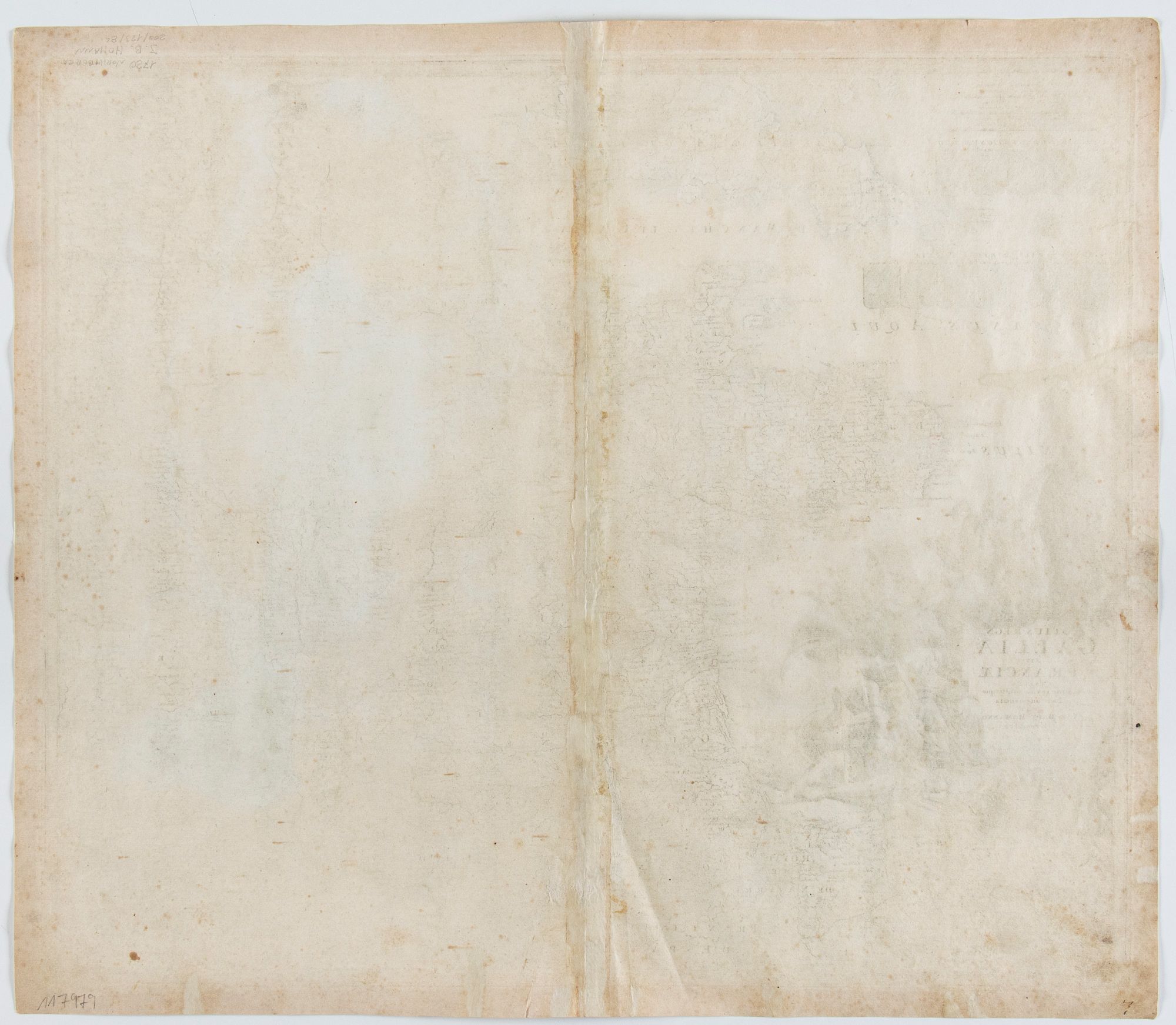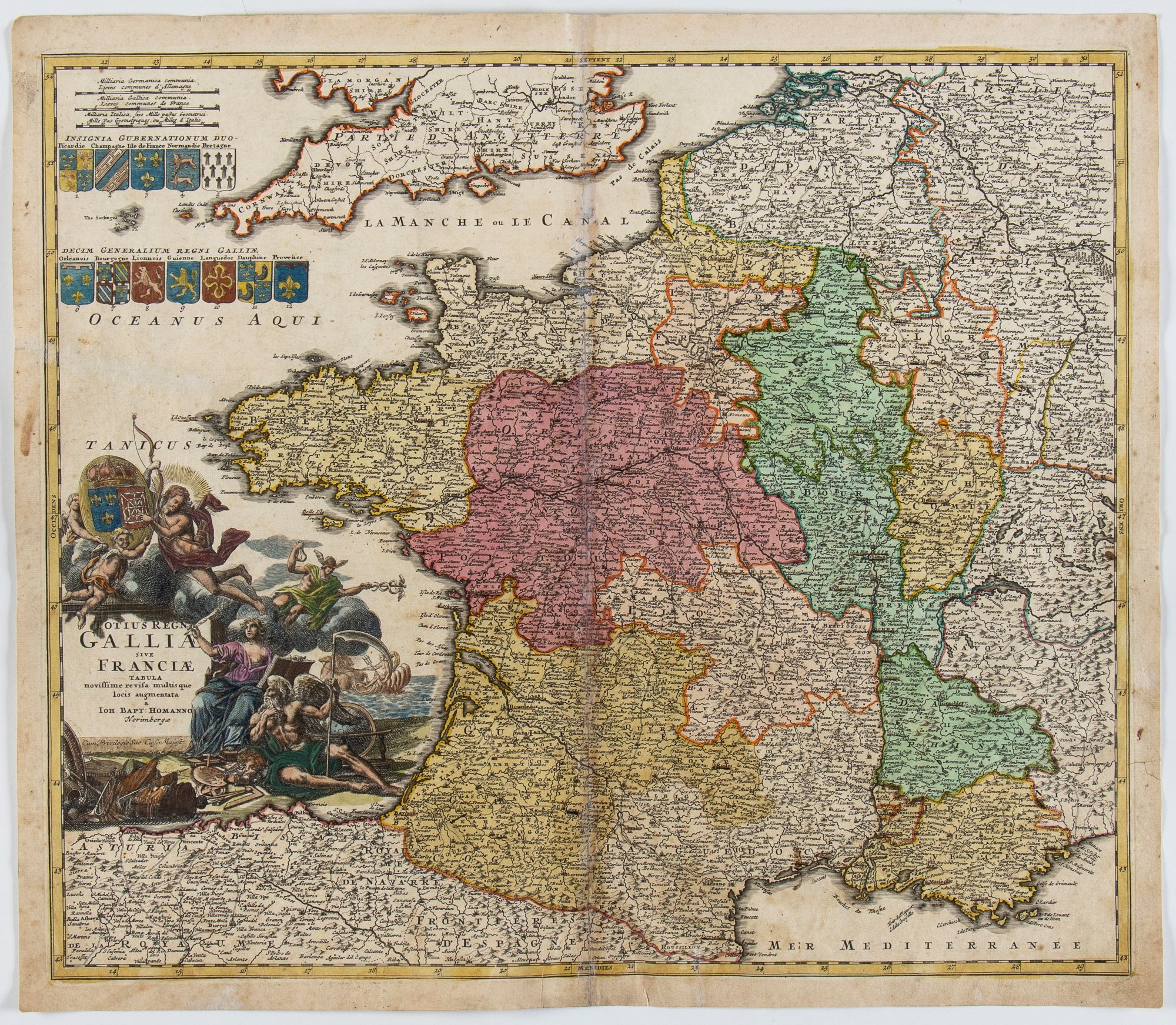 Mappa della Francia con grande cartiglio figurativo e 12 stemmi delle regioni, con bella coloritura coeva. Stampata su carta vergata. Il foglio presenta alcuni piccoli restauri ben eseguiti e scoloritura lungo la consueta piega centrale. Foglio con uniforme brunitura e sgualciture. In generale, in buono stato di conservazione.