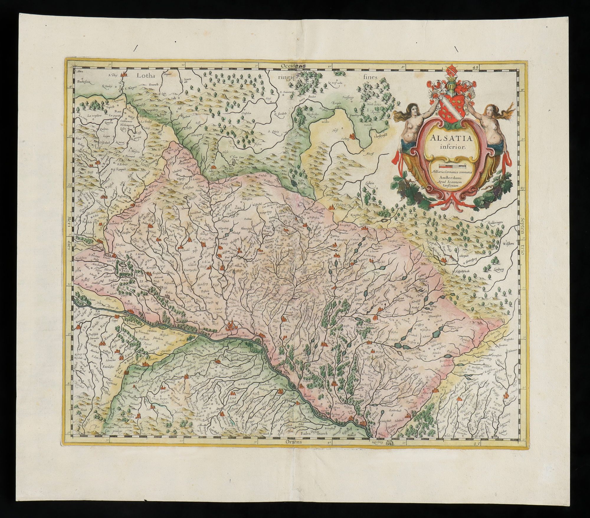 Acquaforte e bulino, 36,2 x 43,5 cm (lastra); 45,2 x 51 cm (foglio). Mappa dell'Alsazia, una regione storica della Francia Nord-orientale, pubblicata da Johannes Janssonius ad Amsterdam.