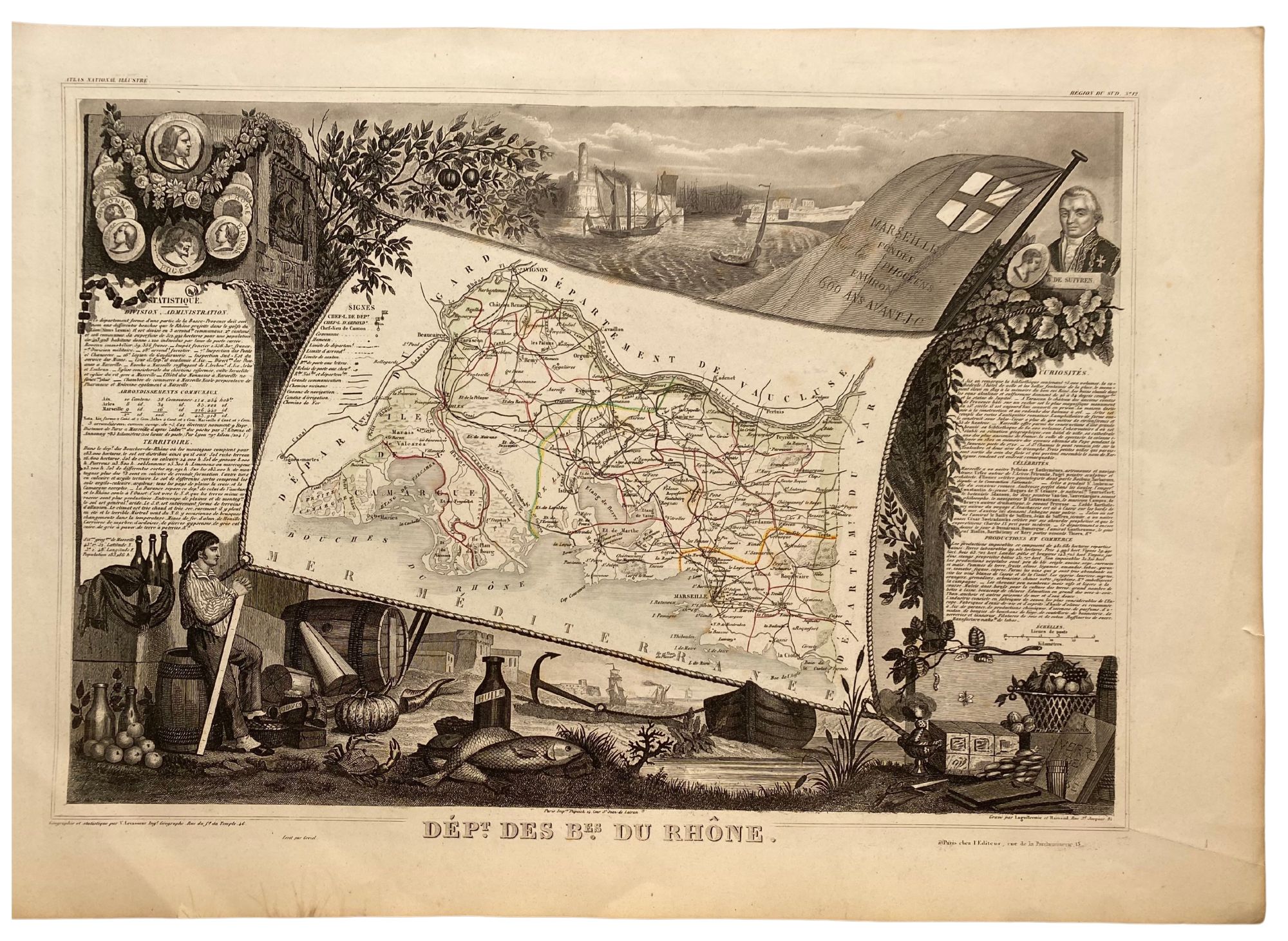 Litografia, 353 x 523 mm (foglio). Mappa del dipartimento francese di Bouches-du-Rhône tratta dall'atlante "Atlas National de la France Illustrée", rappresentante la regione intorno a Marsiglia.