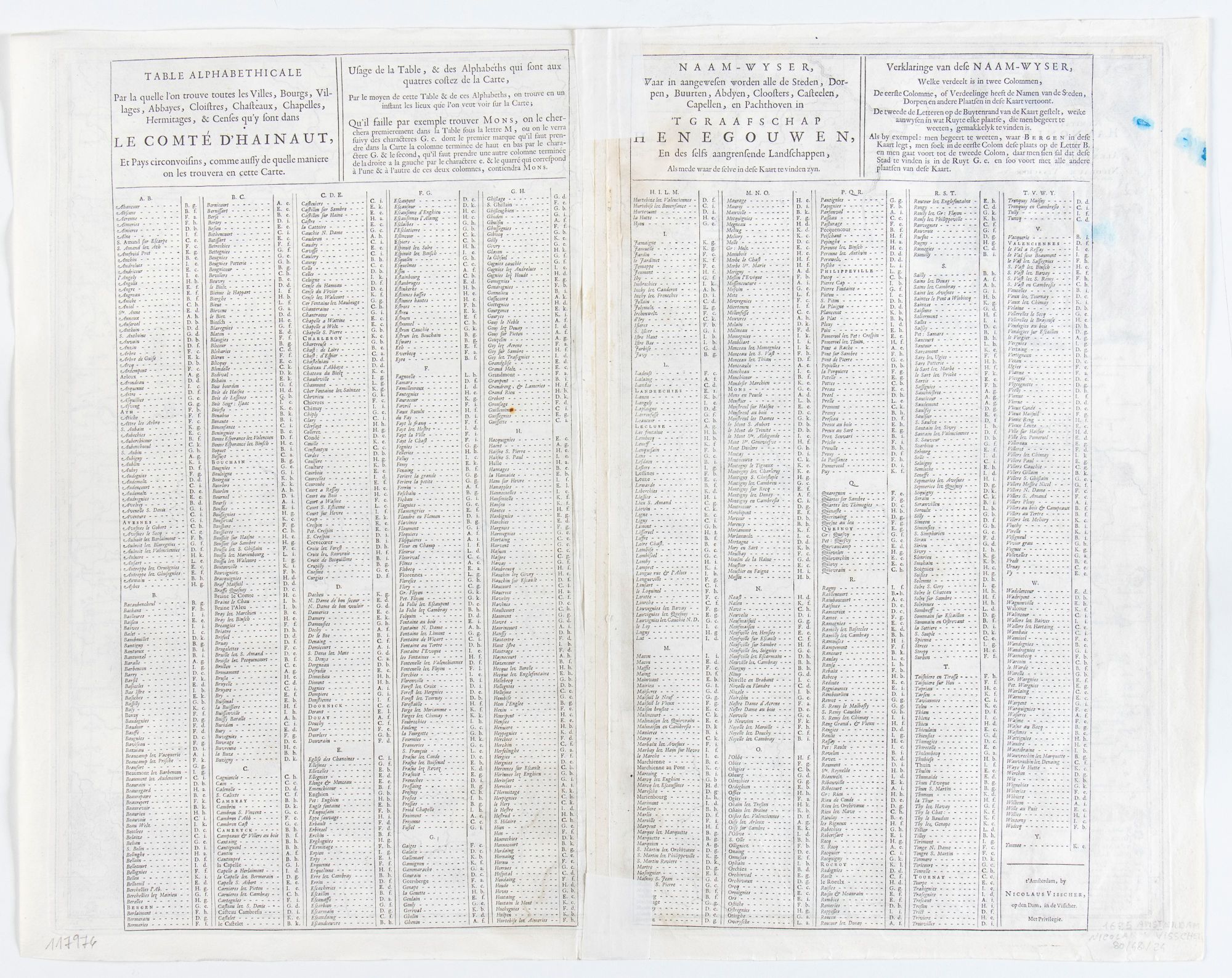 Mappa dell'Hainaut, provincia della Vallonia in Belgio. Bella impressione su carta vergata, con margini di circa 1-2 cm. Bella coloritura coeva. Al verso, testo in francese e olandese. Consueta piega centrale. In ottimo stato di conservazione, salvo leggere sgualciture e un piccolo foro sul margine inferiore sinistro, chiuso al verso.