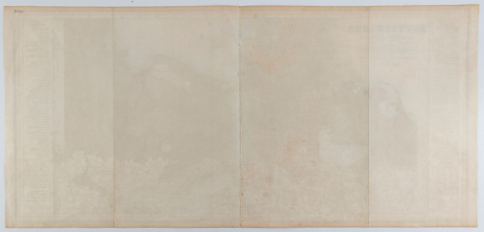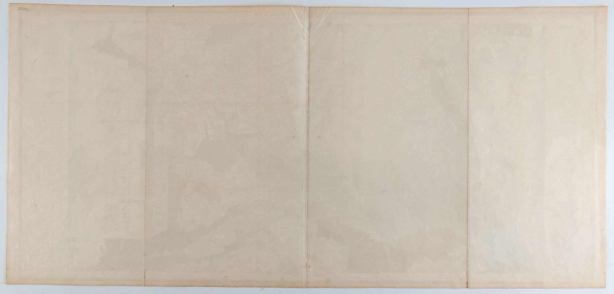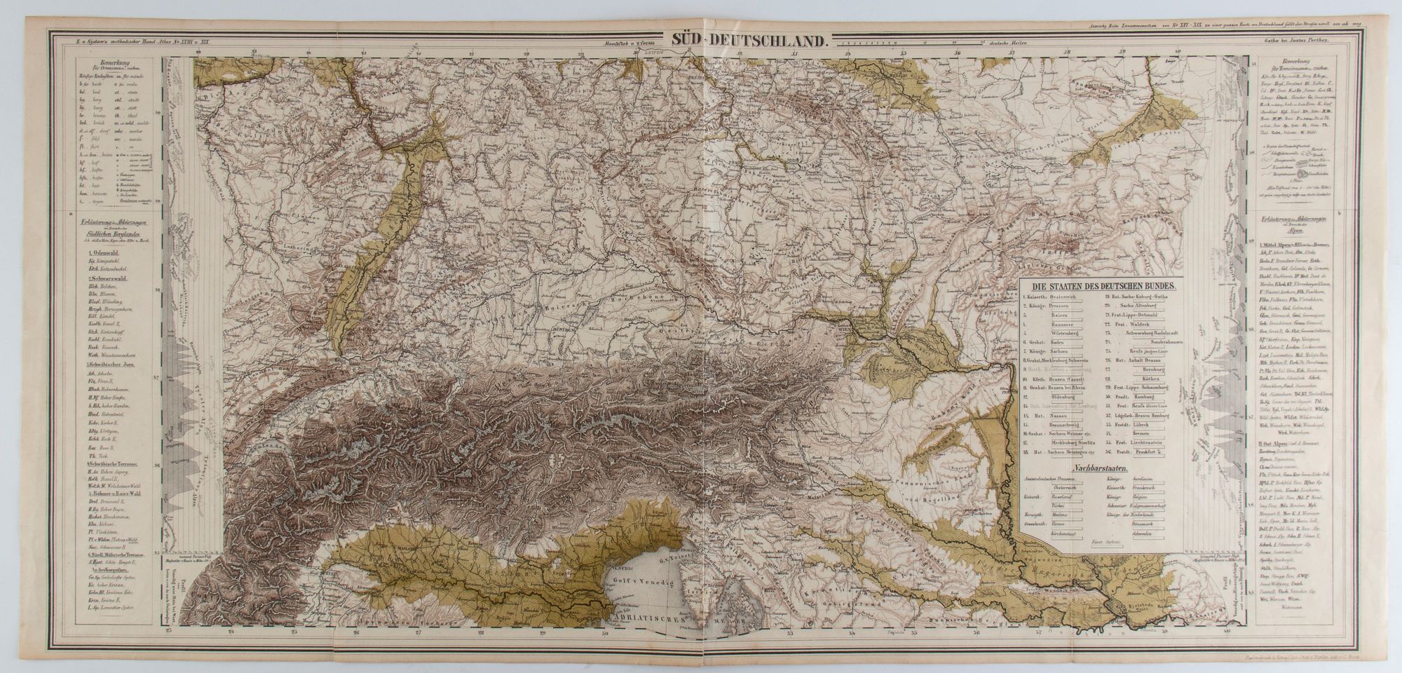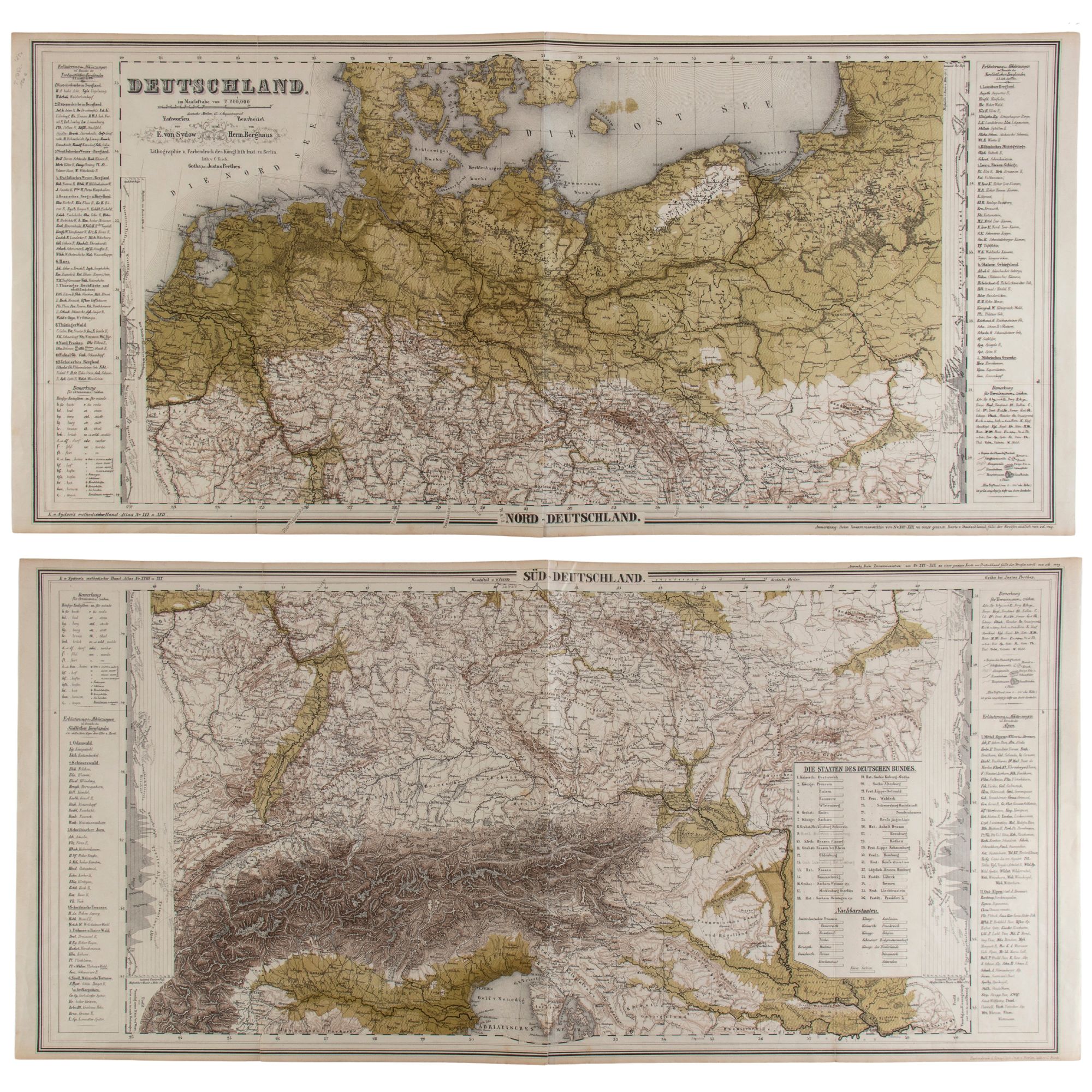 Mappa di Germania, stampata su due fogli ancora da unire. Bella, vivace impressione su carta non vergata. Ciascun foglio presenta 3 consuete pieghe verticali. In ottimo stato di conservazione, salvo leggera brunitura uniforme e brevi strappi sulle pieghe.