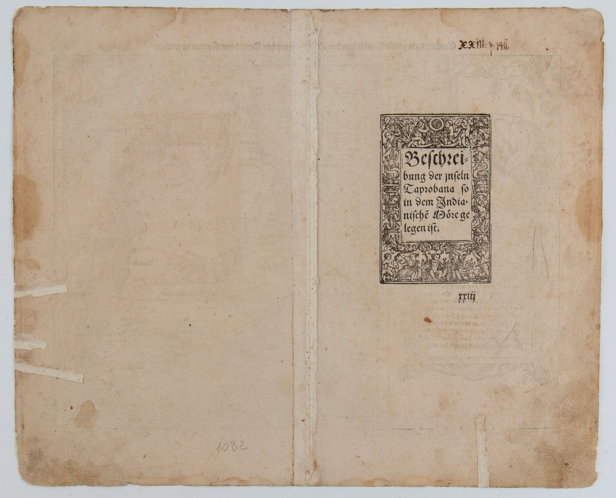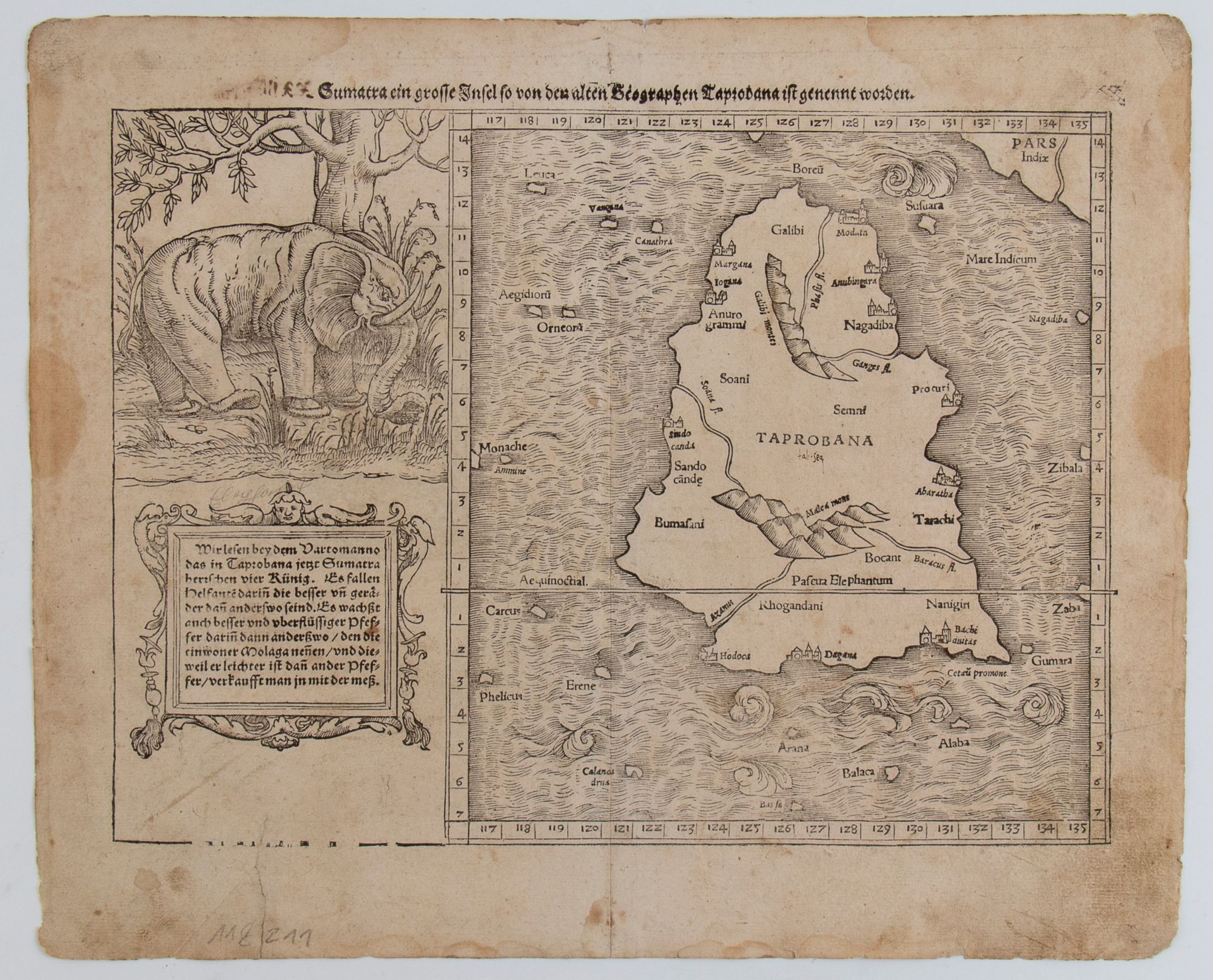 Xilografia, 322 x 392 mm (foglio). Mappa di Taprobana, nome con cui gli antichi Greci identificavano l'isola di Sri Lanka, tratta dall'edizione del 1574 di "Cosmographia Universalis", pubblicata da Heinrich Petri.