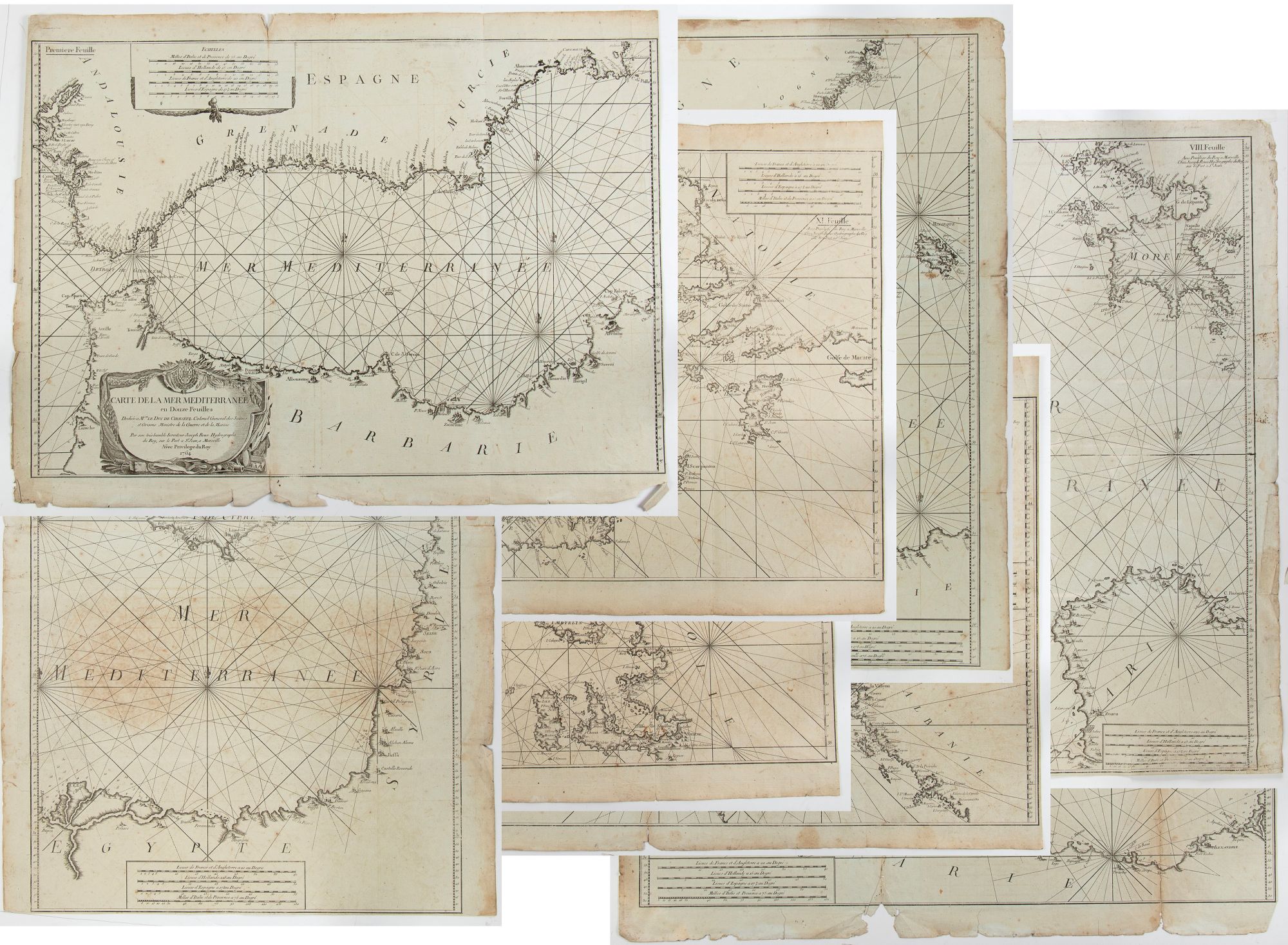 Lotto di 8 carte nautiche tratte da un'opera di 12 grandi tavole del Mediterraneo, raffiguranti porti, fortificazioni e città di tutta la costa mediterranea, incluse le coste di Spagna, Italia, Grecia, Turchia e altre.