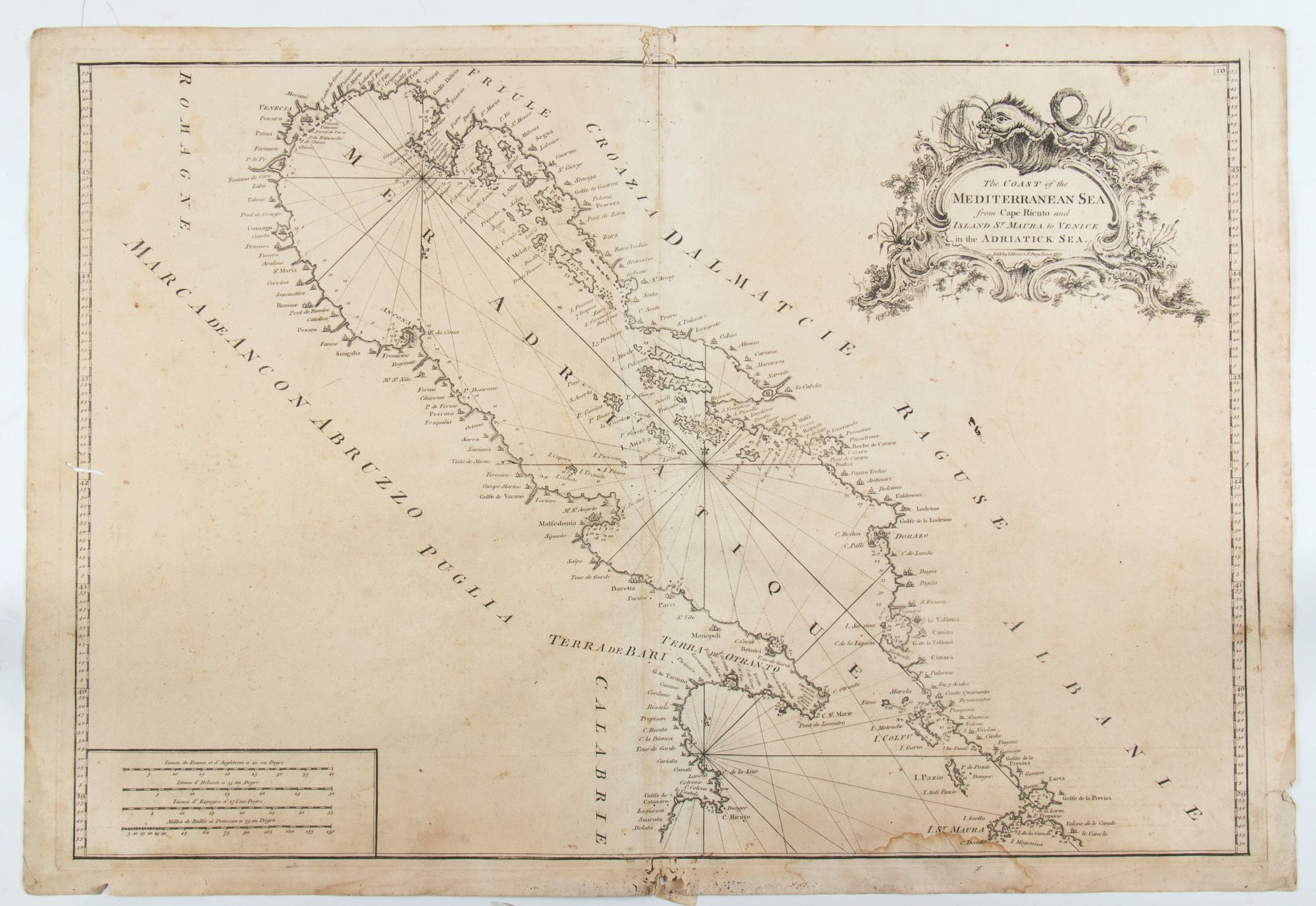 Carta nautica della costa italiana e croata del Mare Mediterraneo, da Venezia a Capo Rizzuto e da Trieste all'Isola di San Mauro. Acquaforte e bulino, 610 x 880 mm.