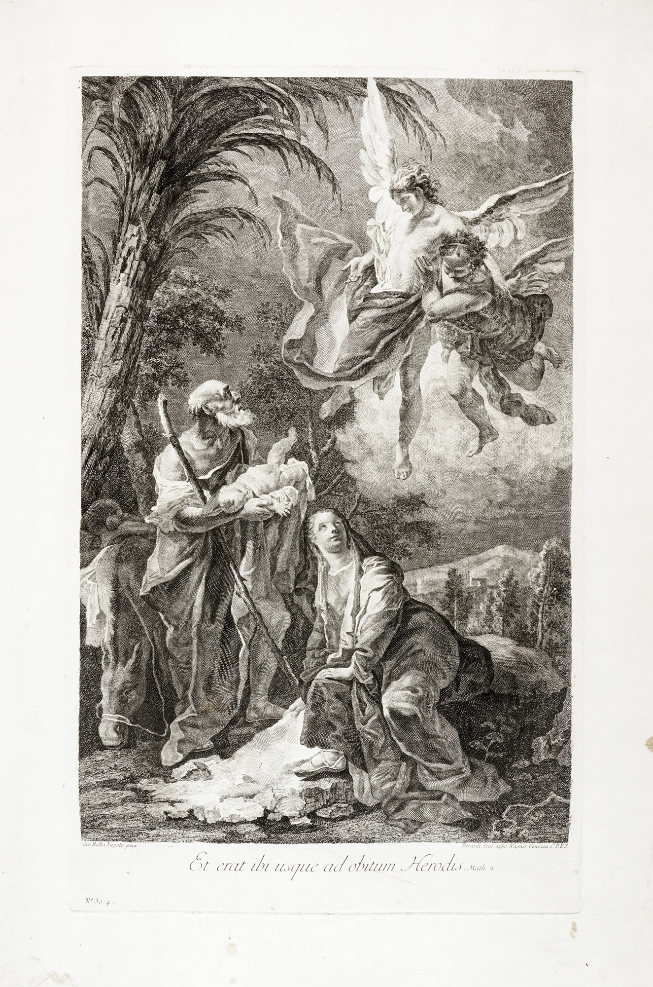 Acquaforte e bulino. mm 580x352. Foglio: mm 695x500. In controparte dal dipinto di Giovan Battista Tiepolo databile al 1720 ca. oggi al San Diego Museum of Art (inv. 1942:127). Al margine inferiore da sinistra "Gio. Batta Tiepolo Pinx", all'estremità destra "Berardi Scul app. Wagner Venezia C.P.E.S". Al centro il verso dal Vangelo di Matteo (capitolo 2) "Et erat ibi usque ad obitum Herodis". In basso a sinistra "No.30.4". Splendida prova di questo foglio non comune su carta vergellata veneta con filigrana "tre mezzelune". (1) Foglio integro con ampi margini come in origine. Al margine inferiore alcune lievi macchie brune, una più marcata al margine destro in basso.