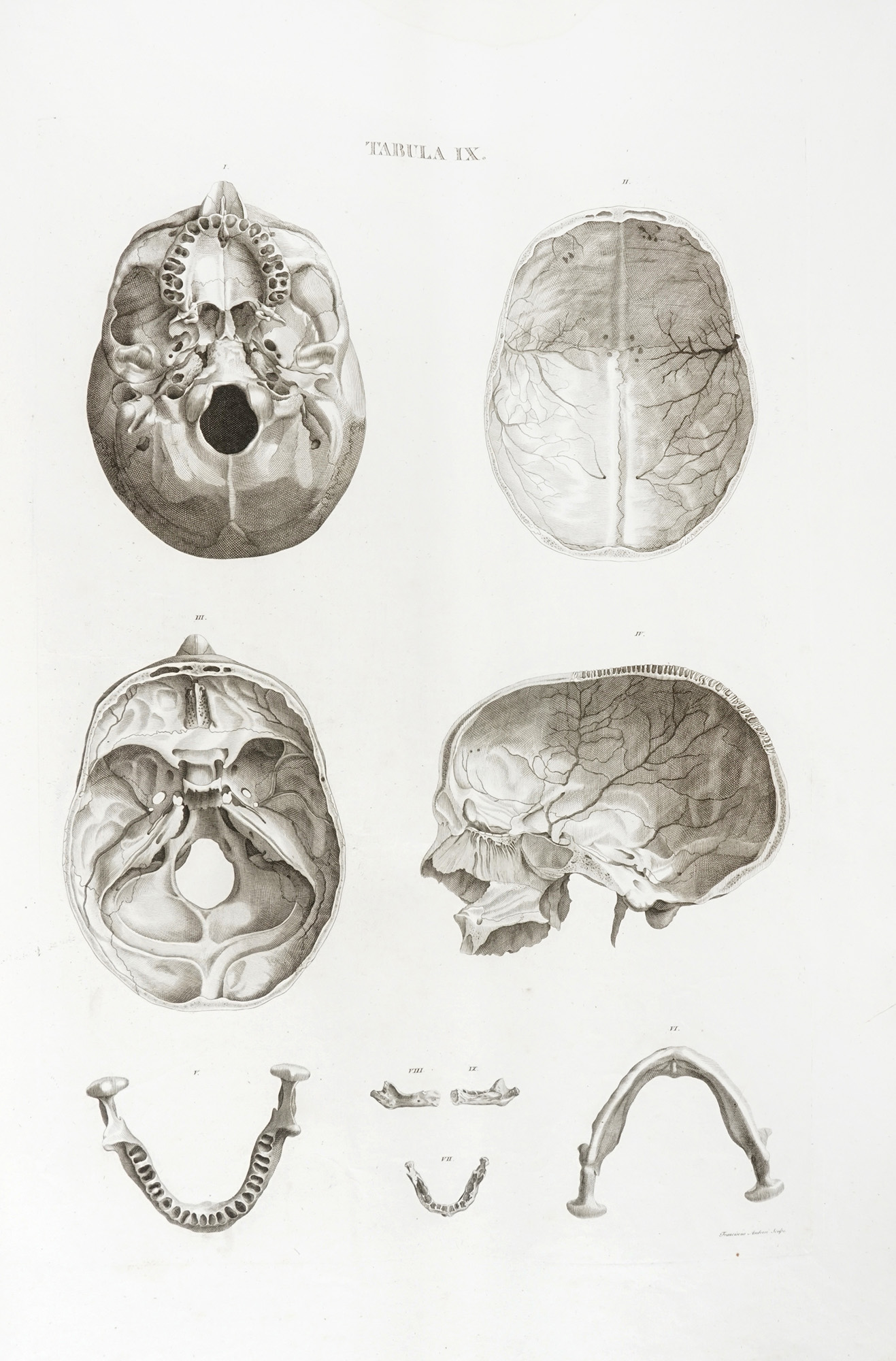 In-folio massimo (mm 760x490) senza più legatura. Frontespizio e 57 tavole, una grande veduta con scena di dissezione di un corpo e 28 tavole numerate da I-XXVIII in copia doppia con parti dello scheletro e delle ossa. Le incisioni a bulino vennero realizzate da Giovanni Battista Torcellan, Gaetano Bosa, Felice Zuliani, Francesco Ambrosi. (58) Fogli integri con margini come in origine, lievemente ondulati in verticale nella parte centrale. Alcune tavole presentano fioriture, vecchia polvere localizzata alle estremità, brevi strappi. Presenti il piatto anteriore e residuo del posteriore, rovinati.
