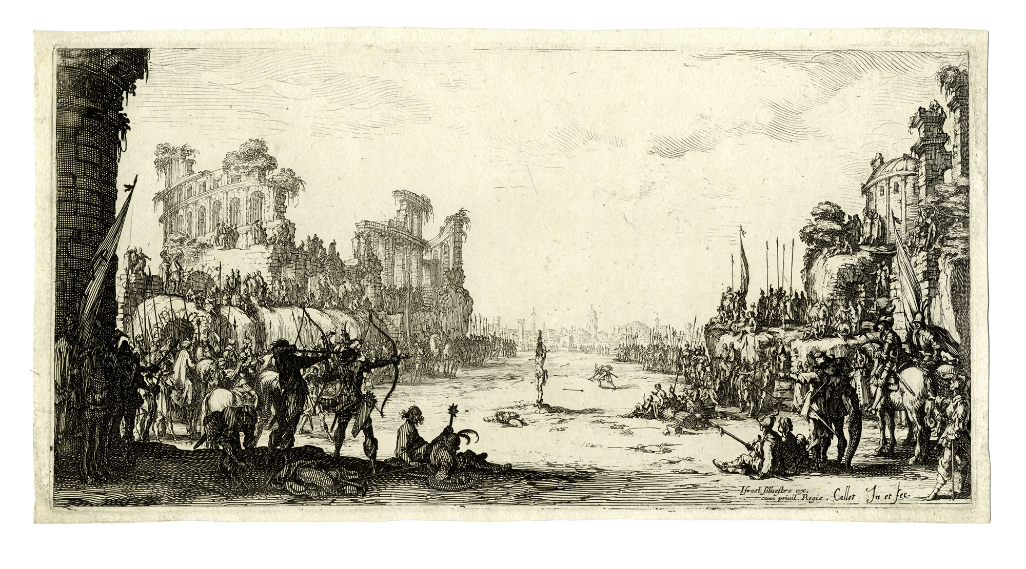 Acquaforte. mm 164x332. Foglio: mm 175x342. Lieure, 670. Sulla lastra in basso a sinistra "Callot In et fec."e l'excudit di Israel Silvestre con il privilegio. Ottima impressione nel II stato di 2 dopo la comparsa dell'excudit di Silvestre, in tiratura tarda su carta vergellata spessa priva di filigrana. (1) Margini di 5/8 mm oltre la battuta del rame. Conservazione molto buona.