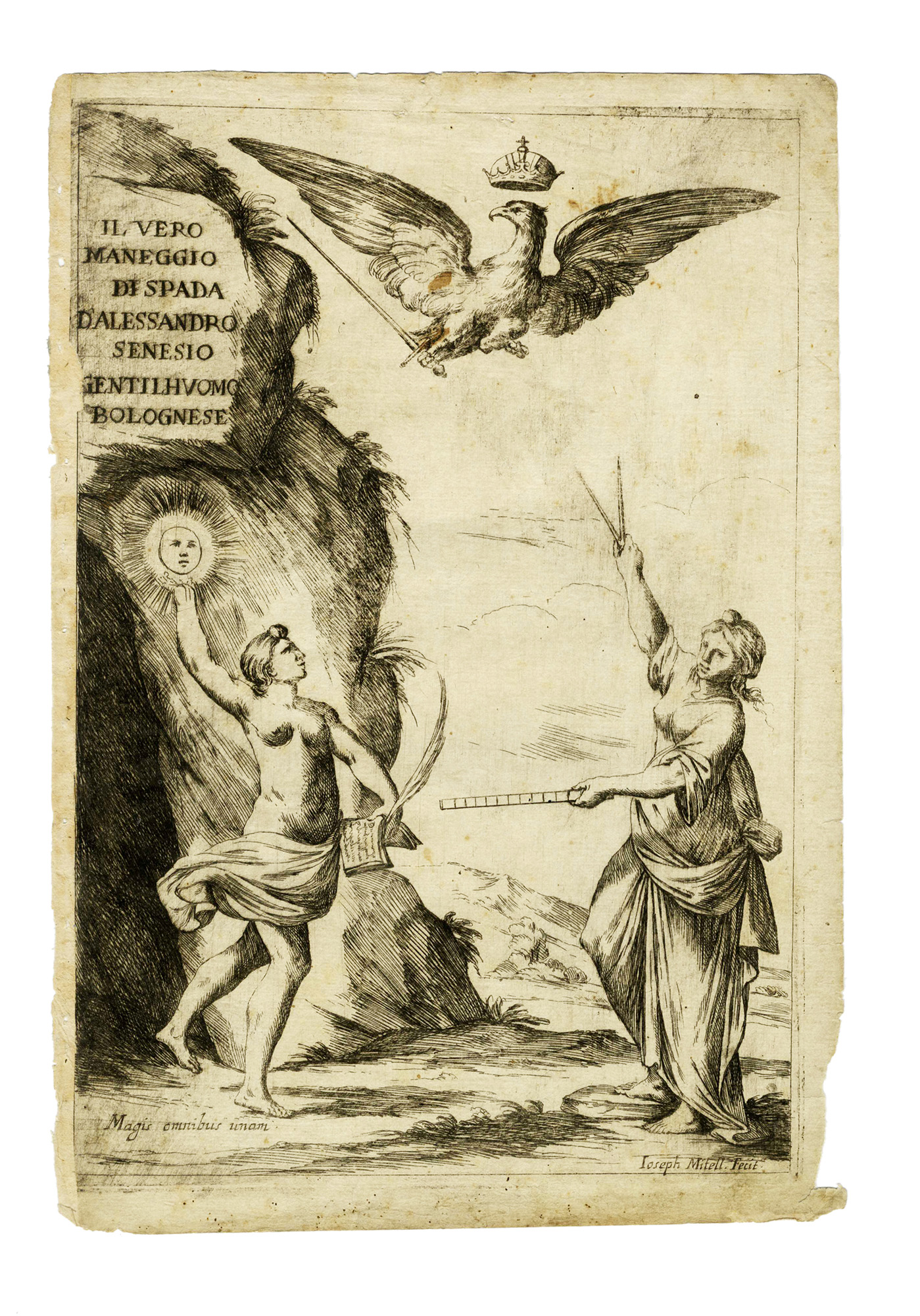 Acquaforte. mm 287x195. Foglio: mm 305x210. Buscaroli, 32. Antiporta allegorico per il volume di Alessandro Senesio, Il vero maneggio di spada. D'Alessandro Senese gentil'huomo bolognese. Dedicato al Sereniss. Prencipe Ferdinando Carlo Arciduca d'Austria... Bologna, Per l'herede di Vittorio Benacci, 1660. Carta vergellata sottile priva di filigrana. (1) Esemplare con margini. Lieve ingiallimento del foglio, mancanza al margine destro in basso, minimi forellini di tarlo e fori di legatura al margine sinistro.