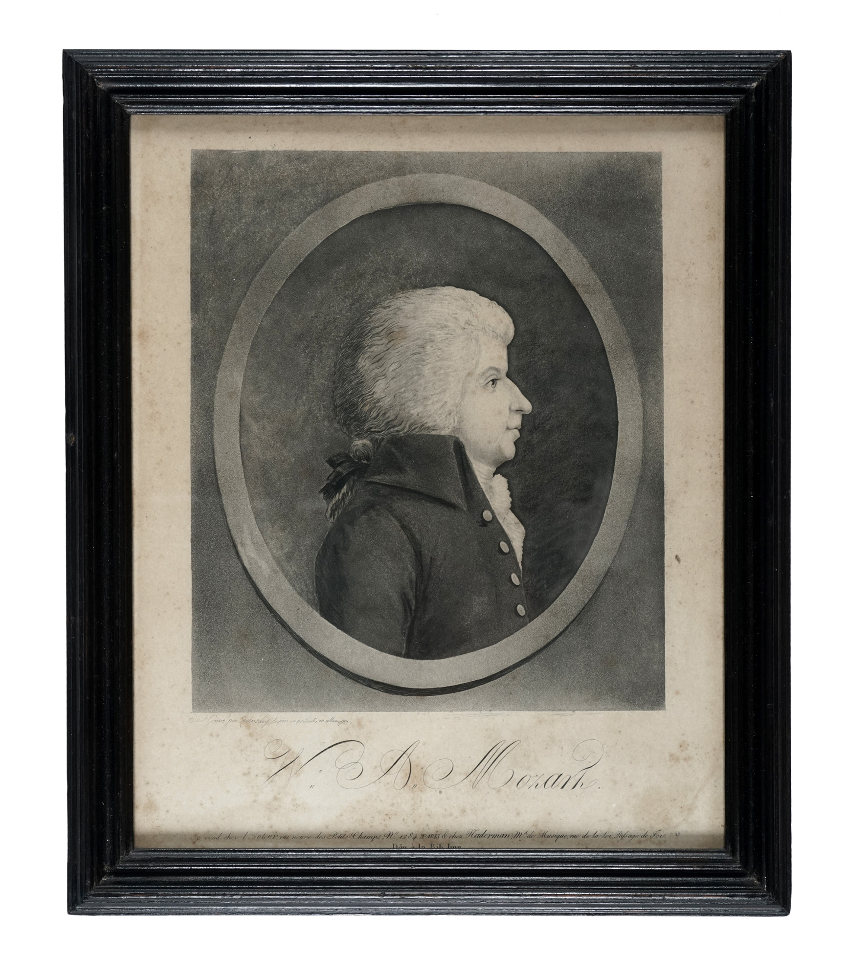 Acquaforte e acquatinta. mm 240x190. Coppia di ritratti realizzati con physionotrace. Al margine inferiore del ritratto di Mozart: "dess. et Gravé par Quenedey d'aprés un portait, en allemagne / W. A. Mozart / Se vend chez l'Auteur, rue neuve-des-Petits-Champs, N. 1284, A Paris & chez Naderman, M. de Musique, rue de la Loi, passage de Foi / Dép. a la Bib. Imp.". Il ritratto di Gluck è tratto da un busto in terracotta (1774), di Jean-Antoine Houdon (1741-1828). Al margine inferiore si legge "dess. au Physionotrace et Gravé par Quenedey d'aprés le Buste de Gluck / Se vend chez Quenedey rue Neuve-des-Petits-Champs, N. 15, a Paris / Dép. a la Bib. Imp.". (2) Entrambi i ritratti rifilati alla battuta del rame e inseriti in vecchia cornice ebanizzata d'epoca. Lieve ingiallimento del foglio con alcuni punti di fioritura. Con la cornice: cm 28x23,5.