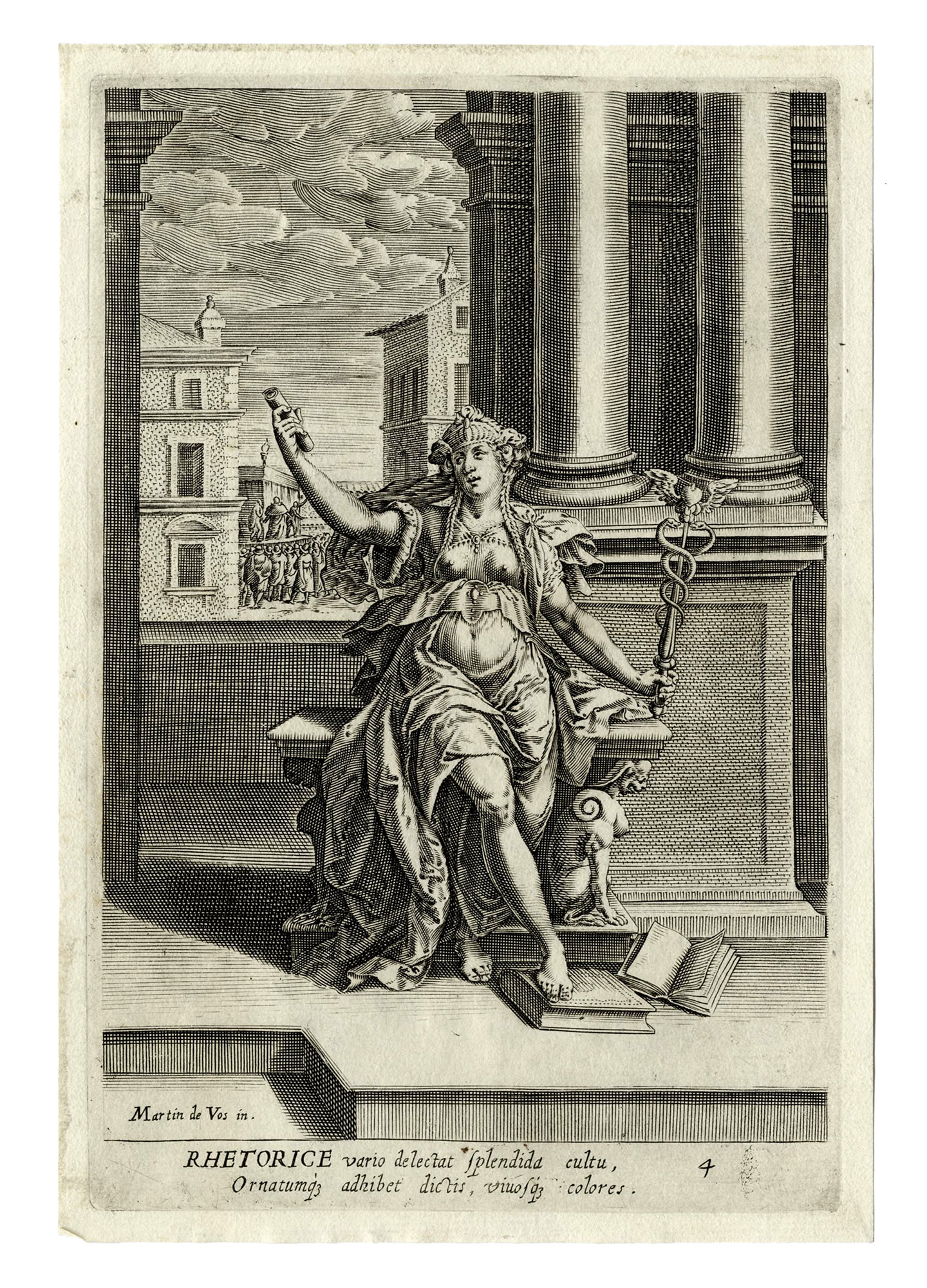 Bulino. mm 228x150/152. Foglio: mm 233/245x162/167. Da invenzioni di Maarten de Vos con indicazione su tutte le incisioni. Sei tavole con numerazione progressiva al margine inferiore a sinistra e iscizione su due righe, da una serie di sette dedicata alle Arti liberali (mancante la tavola con la Musica). Alla prima tavola sulla lastra in basso a sinistra l'indirizzo "Calistus Ferranti Formis Roma". Ottime impressioni stampate con nitidezza e segno pieno su carta vergellata sottile, filigrana "tre monti" visibile alla tavola 6. (6) Cinque esemplari con margini di 5/8 mm oltre l'impronta del rame, la tavola 1 rifilata alla battuta in basso e con lieve ingiallimento alle estremità dei margini.