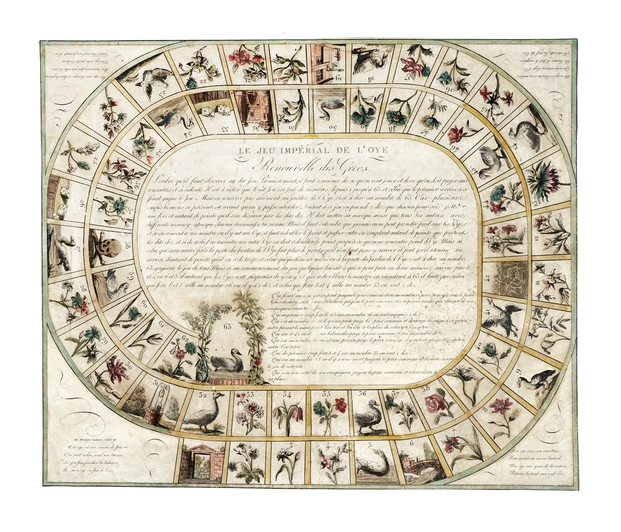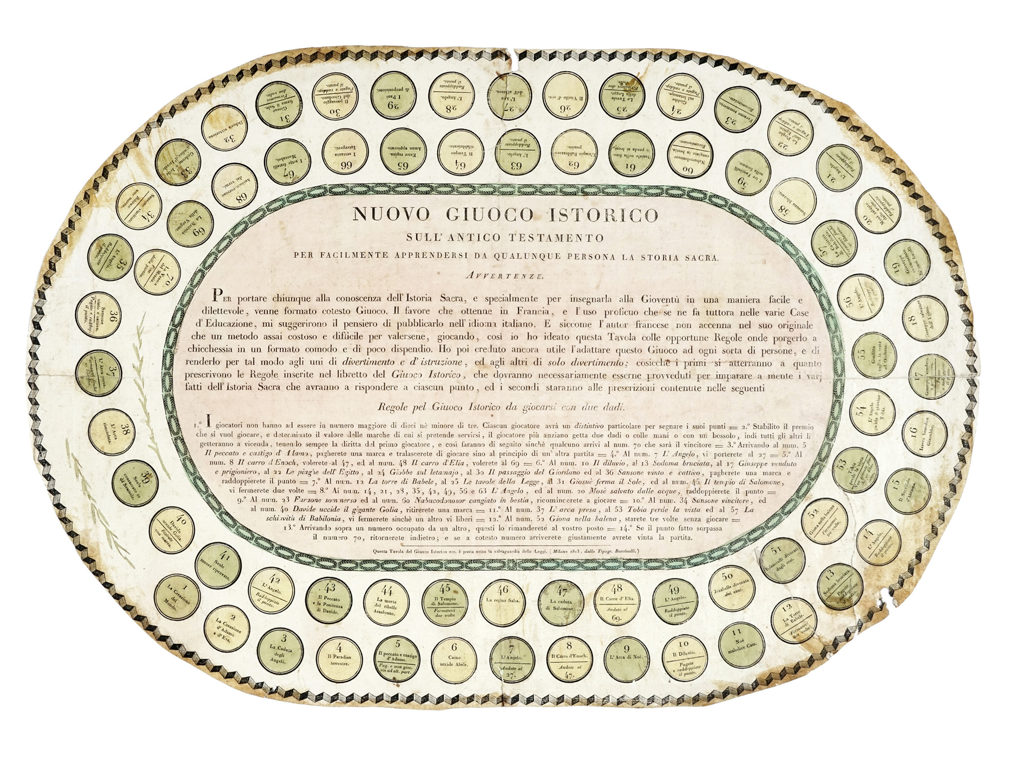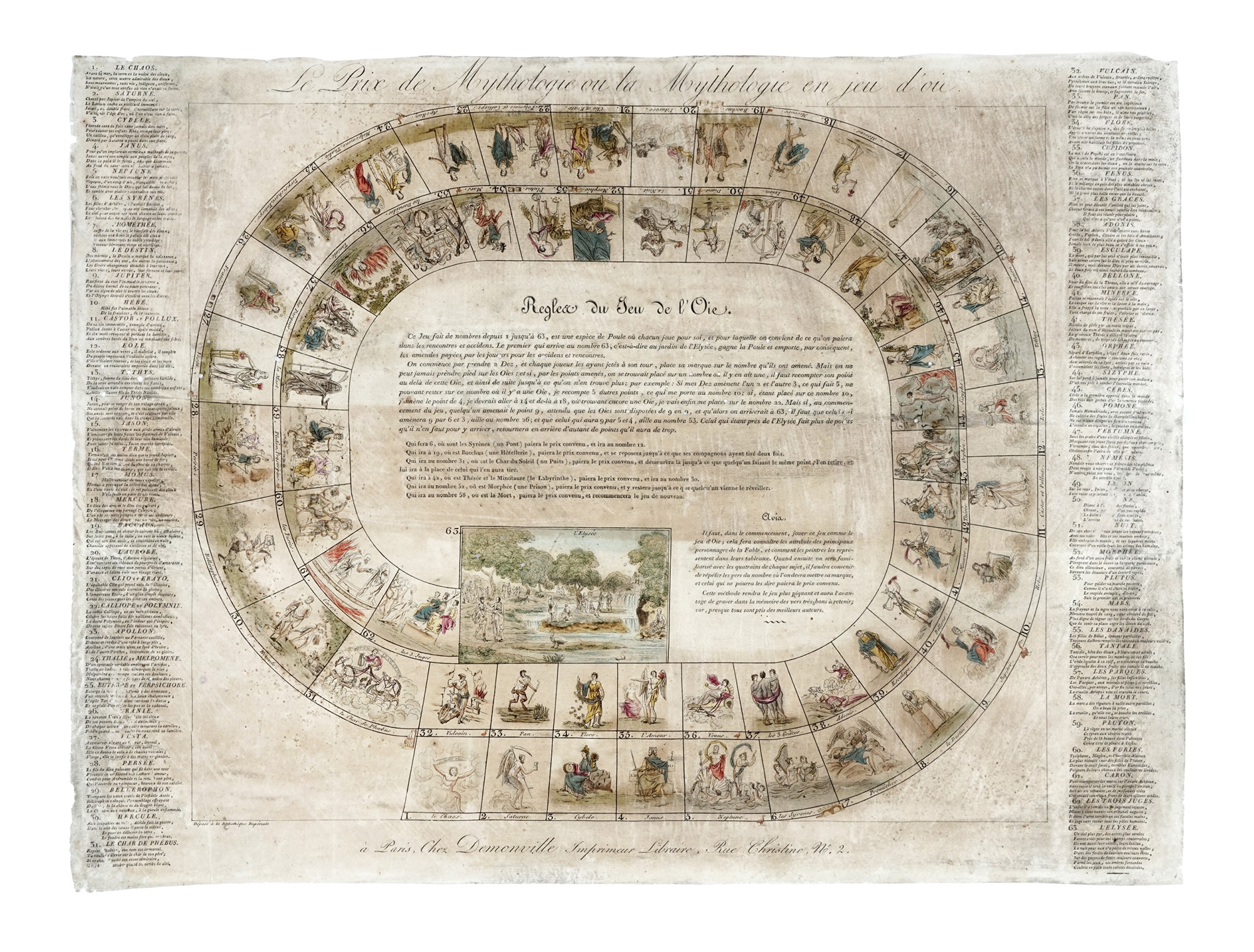 Incisione in rame in coloritura. mm 420x565. Tabellone da gioco con 63 scomparti numerati, ciascuno con raffigurazione di un personaggio mitologico, disposti a spirale attorno a un pannello centrale, in cui sono dettagliate le regole e a una vignetta con i Campi Elisi. Su due colonne a sinistra e a destra alcuni versi dedicati ai personaggi raffigurati. SI AGGIUNGONO: Le jeu impérial de l'oye / Renouvelle des Grecs. Incisione in rame in coloritura. mm 355x428. / Nuovo giuoco istorico sull'antico testamento. Milano: Tipografia Buccinelli, 1813. Incisione in rame in coloritura. mm 395x578. (3) Tutti gli esemplari presentano difetti (vecchia polvere, fori di tarlo, segni d'uso, strappi, ingiallimento). La tavola 3 rifilata all'inciso in ovale.
