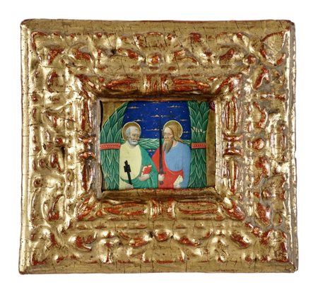 Capolettera miniato lettera N con i santi Pietro e Paolo. XIV secolo. Tempera...