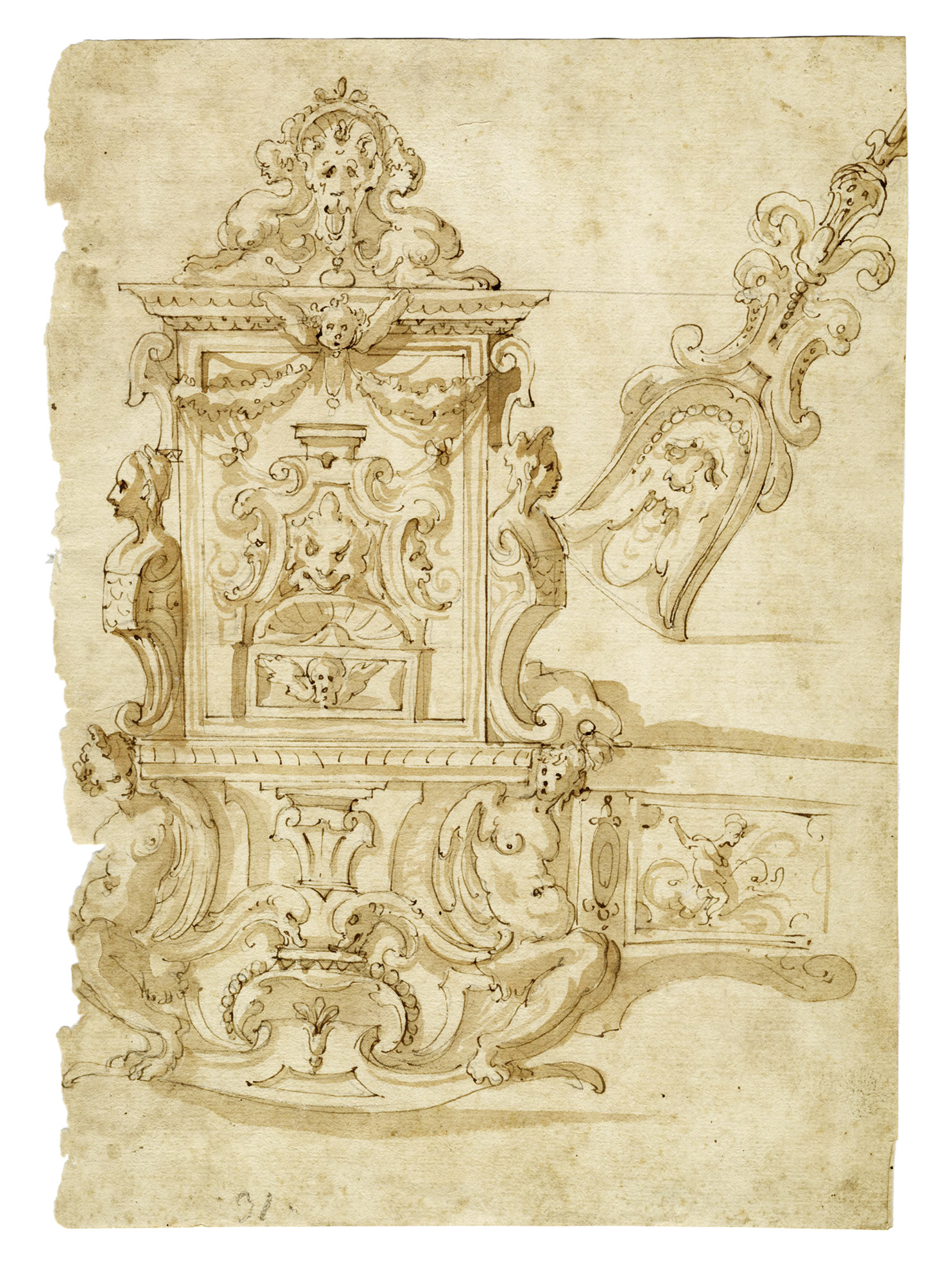 Anonimo della fine del XVI secolo, Progetto architettonico con mascheroni, arpie e delfini.