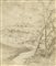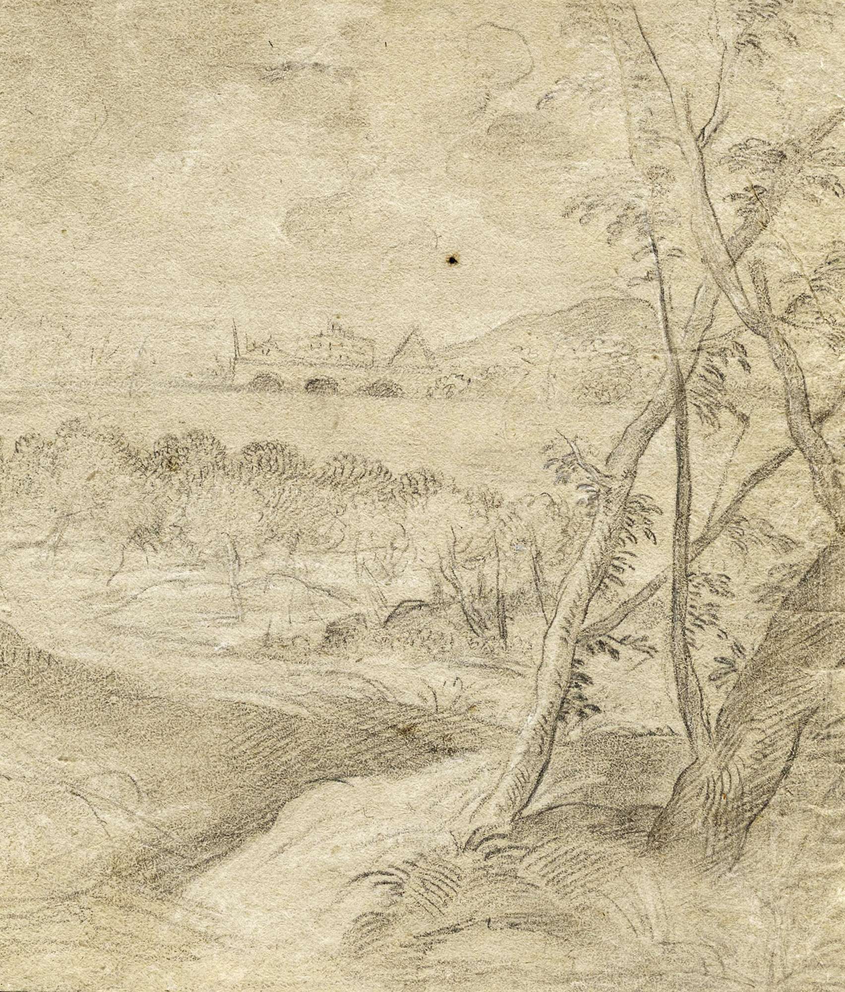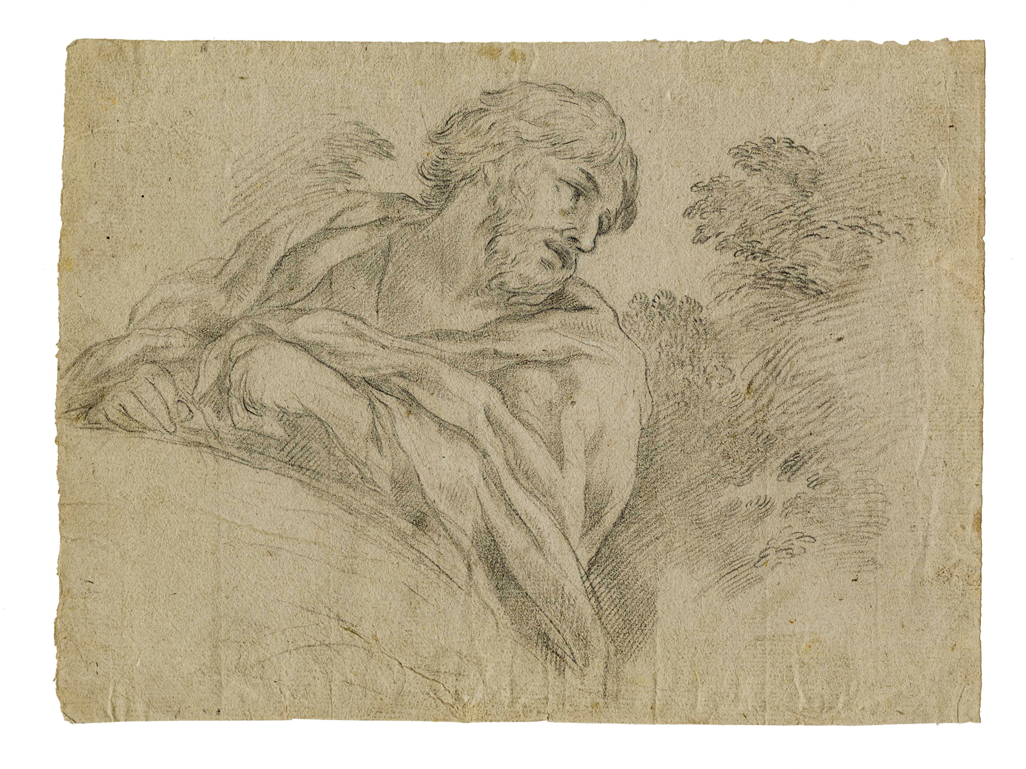 Scuola romana della seconda metà del XVII secolo, Studio per figura virile a mezzo busto con lo sguardo in basso a destra (r) / Paesaggio fluviale (v).