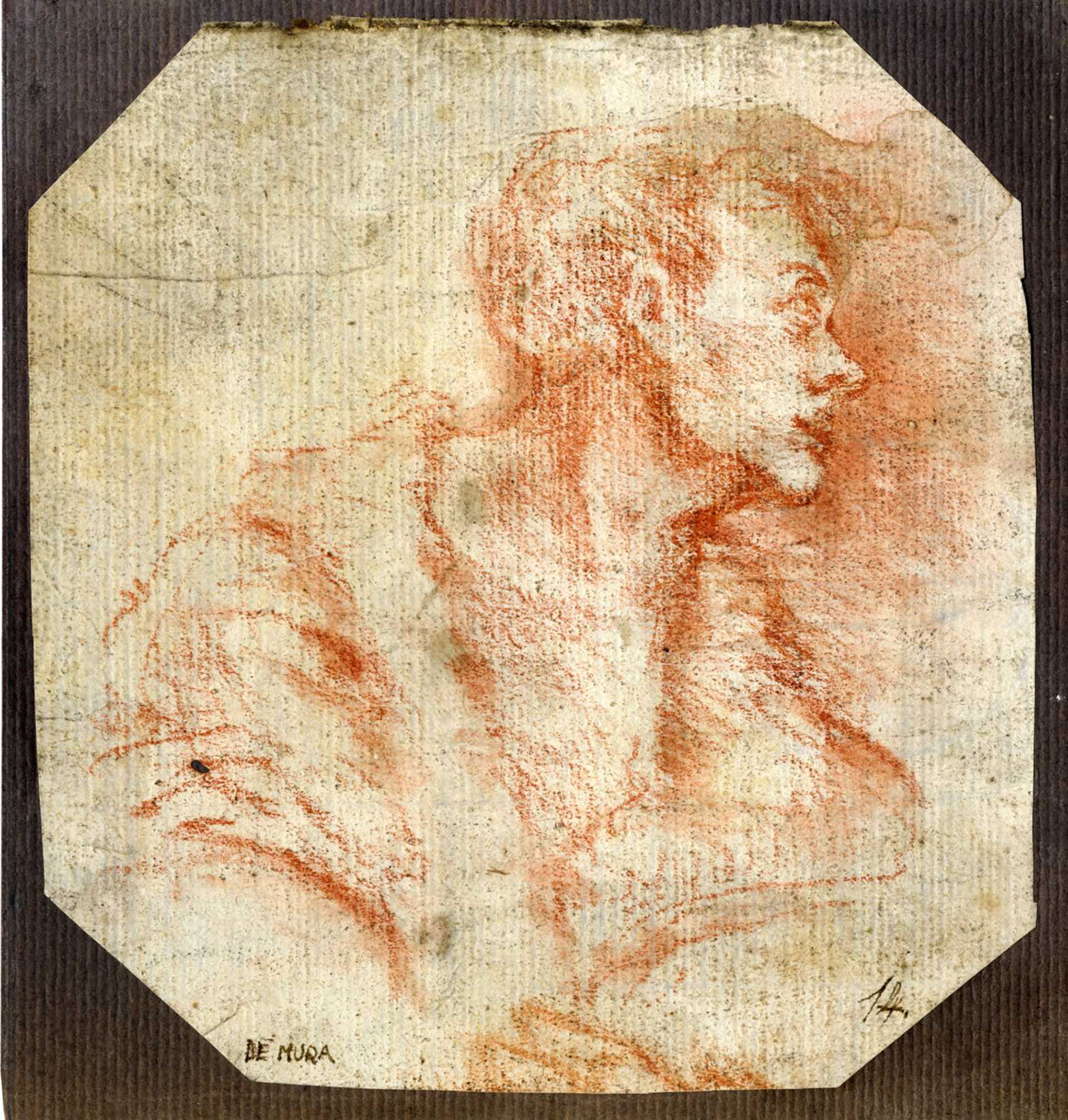 Matita rossa su carta vergellata color crema. Foglio resecato agli angoli. mm 145x135. In basso a sinistra "DE MURA" e a destra "14" a penna e inchiostro bruno. Applicato a pieno su cartoncino color marrone. (1)