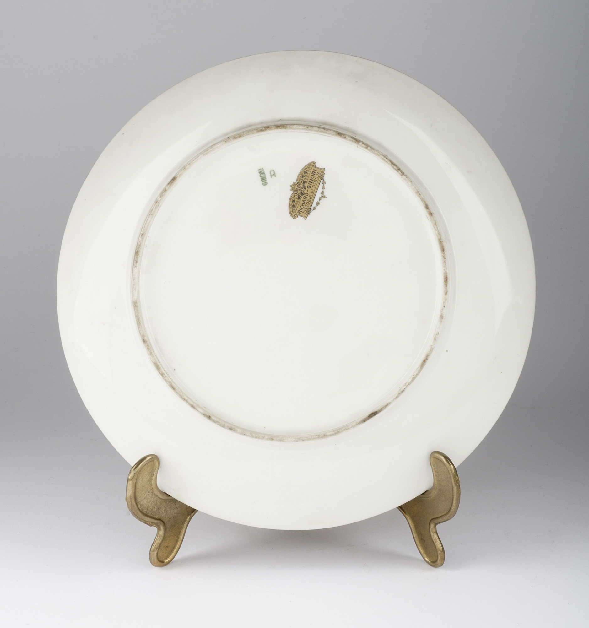 Piatto decorativo con larga fascia in oro con gigli a rilievo. Al centro scena mitologica dipinta con quattro sirene al bagno tra fiori di ninfea. Ø cm 23,5. Al verso marchio "GINORI" in verde sotto vernice con lettera "D" (1880-1930) e cartiglio in oro presente su oggetti con decori di particolare pregio eseguiti nella Pittoria di Doccia (1900-1930). (1) Ottima conservazione.