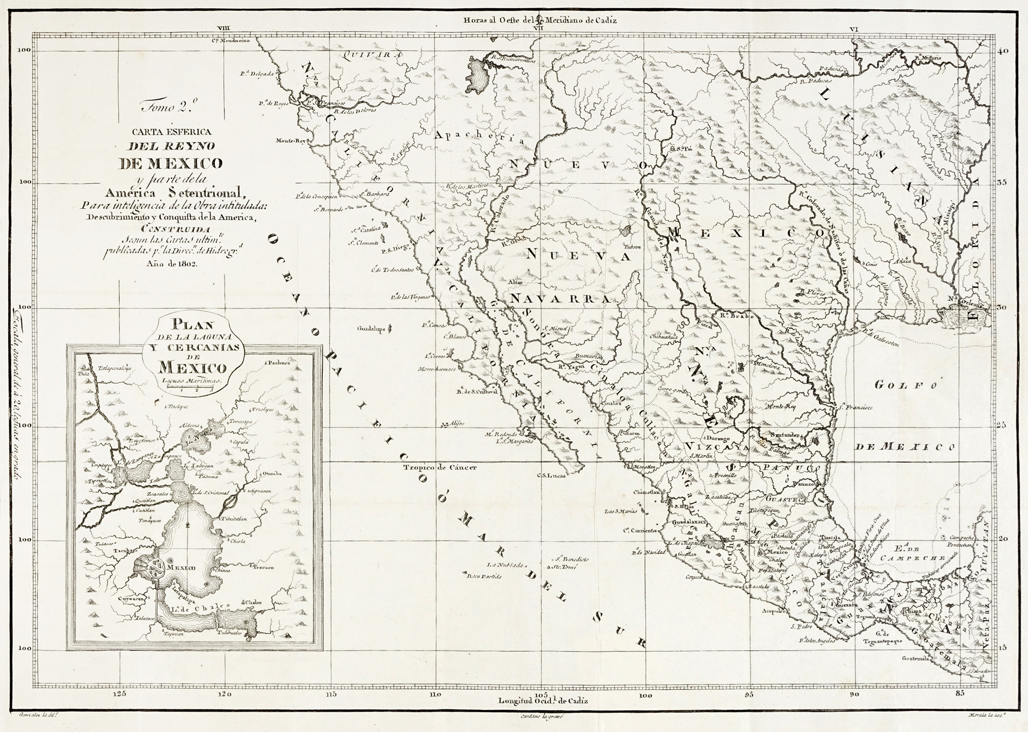 Incisione in rame. mm 330x470. Foglio: mm 372x502. Tratta da Juan Corradi, Descubrimiento y conquista de la América o Compendio de la historia general del Nuevo Mundo, Madrid, Imprenta Real, 1803 (traduzione di William Robertson, History of America, Edinburgh,1777). Al margine in basso le indicazioni di responsabilità: Tomás González (autore principale), José María Cardano, Felipe Cardano (incisori), Juan Morata y Gangoiti (incisore del testo). La mappa è basata sulle ultime informazioni spagnole disponibili con la cartografia basata su Bernardo de Miera Plan de la Provinca Interna de el Nuevo Mexico di Y Pancheco (1778). Carta insolitamente dettagliata alla data 1802, alcune informazioni altamente protette non furono diffuse fino alla comparsa della mappa di Humboldt del 1811. Qui il Rio Buenaventura corre verso sud-ovest nel Grande Lago Salato, e da ovest il Rio de los Dolores si spinge troppo nell'entroterra e quasi si collega al lago. Questo errore sarebbe rimasto fino alle esplorazioni di Fremont negli anni Quaranta dell'Ottocento. Eccetto le inesattezze nei sistemi fluviali, i dettagli dell'entroterra sono limitati ad alcuni nomi di luoghi e ad alcune caratteristiche topografiche di base. La mappa è arricchita in basso a sinistra da un riquadro di Città del Messico e dei suoi dintorni. (1) Margini come in origine su tre lati, con piccolo margine oltre la linea d'inquadramento a sinistra. Pieghe editoriali da inserimento in volume.