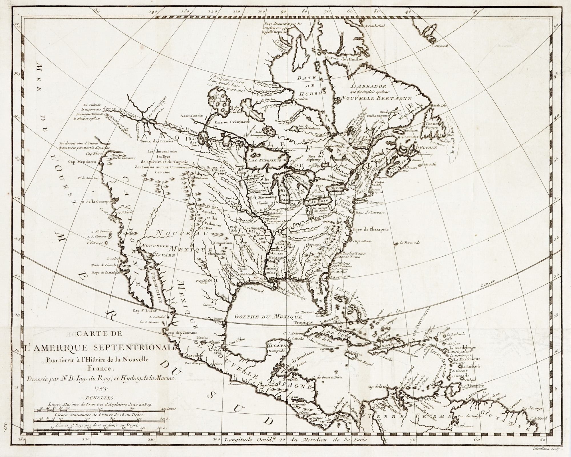 Jacques Nicolas Bellin Guillaume Dheulland, Carte de l'Amerique Septentrionale Pour servir àl'Histoire de la Nouvelle France. 1743.