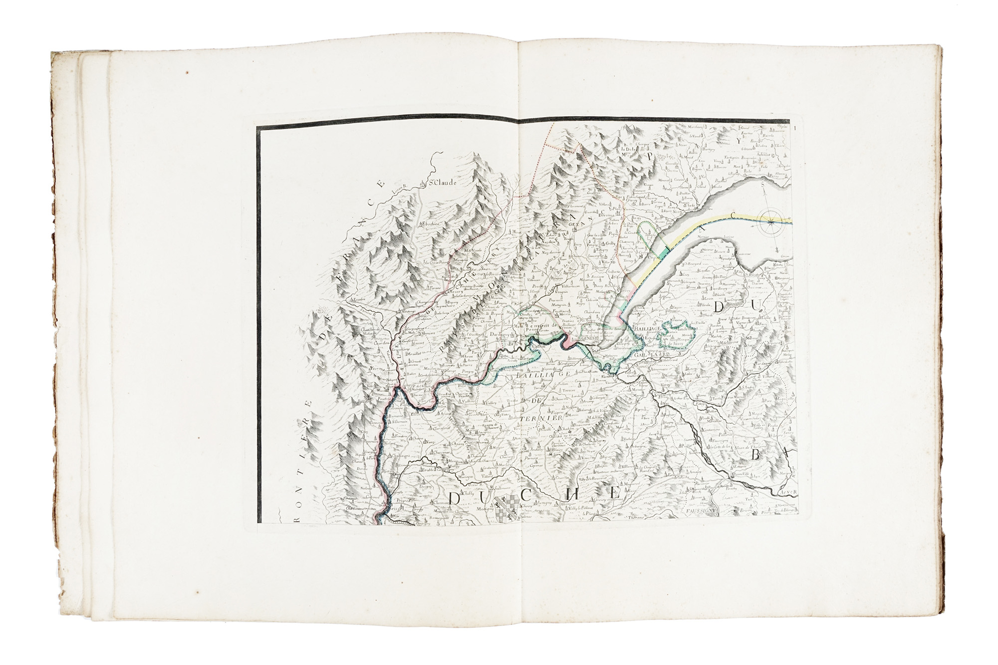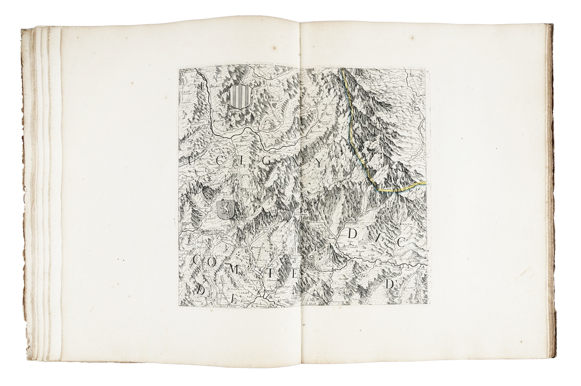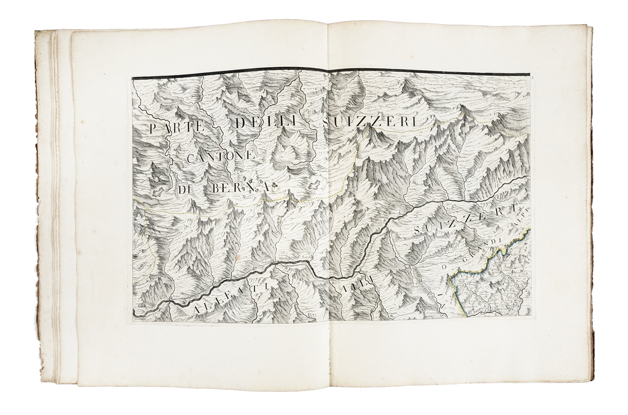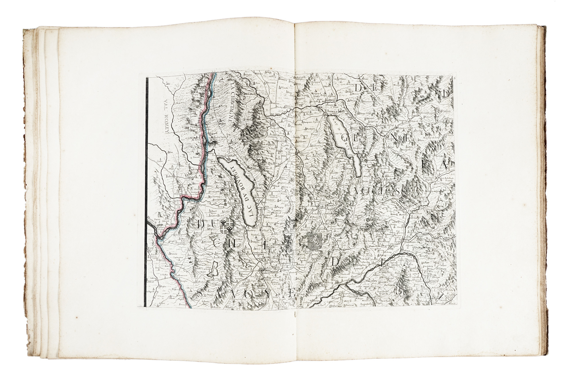 Grande in-folio (mm 530x420). Legatura in cartone marmorizzato e dorso in pergamena a sei nervi. Grande mappa in 25 tavole ad acquaforte e bulino con confini in coloritura rilegate in volume. La prima edizione della mappa datata 1683 dal titolo Carta generale de' Stati di Sua Altezza Reale fu disegnato da Tommaso Borgonio e incisa da Giovanni Maria Belgrano. Nella presente edizione del 1772 vennero aggiunti alcuni fogli, raffiguranti i paesi di nuovo acquisto, incisi da Stagnon su disegni di Castellino, Galletti e Boasso e vennero anche apportate alcune modifiche ai fogli disegnati dal Borgonio. Borgonio, ingegnere cartografo, disegnatore e calligrafo, addetto fin dal 1650 alla corte Sabauda, pubblicò nel 1683 la sua grande mappa in 15 fogli incisi su rame. Nonostante alcune inesattezze nell'orientamento e nelle distanze, la mappa risultò di gran lunga superiore alle precedenti raffigurazioni della regione sia per la ricchezza di informazioni relative ad abitati, strade, corsi d'acqua, sia per la rappresentazione dell'orografia resa artisticamente mediante un tratteggio semiprospettico detto alla "cavaliera". Nuove edizioni della mappa vennero pubblicate a Londra nel 1765 a cura di A. Dury, e appunto a Torino nel 1772 a cura dell'incisore piemontese Stagnon. La versione incisa da Stagnon è tratta dagli stessi rami del Borgonio ma corretti ed arricchiti, e con l'aggiunta di nuovi fogli per estendere la carta alla Liguria e a parte della Lombardia. Presso la Biblioteca dell'I.G.M. sono conservati un esemplare nell'edizione 1772 in 12 fogli montati su tela a stacchi. Una copia in volume di 25 tavole originali comparabile a quella presente; una copia in 25 fogli sciolti originali. Bibliografia: A. Mori, Tomaso Borgonio e la sua opera cartografica, in "Riv. Geogr. Ital.", XIII, 1906.A. Mori, La cartografia Ufficiale in Italia e l'I.G.M.(Capitolo Regno di Sardegna), Firenze, 1922. (1) Legatura con evidenti tracce d'uso: al piatto anteriore l'angolo in basso è staccato. Fogli interni in carta vergellata pesante, intonsi, minime fioriture e piccoli fori di tarlo su alcuni.