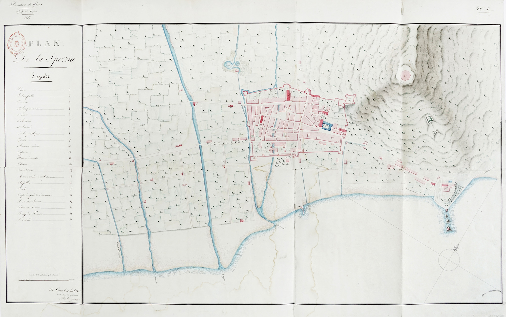 Penna e inchiostro bruno, pennello e acquerello azzurro, verde, rosso, seppia. Carta vergellata pesante leggermente azzurrata. mm 610x974. Mappa rilevata e disegnata del Golfo di La Spezia a opera del colonnello ingegnere Hyacinthe Boucher de Morlaincourt, direttore delle fortificazioni della 18ª Divisione di Genova. Carica che ricevette dopo la campagna dell'anno XIII (1804-1805) e mantenne fino al 1813. Venne inviato da Napoleone a La Spezia per valutare la fattibilità nell'insenatura del Varignano di un grande arsenale sul modello di Tolone, pertanto il suo rilievo prende in esame soprattutto l'aspetto militare. Sul lato sinistro della mappa grande legenda manoscritta con in alto il timbro in rosso del Dépôt général des Fortifications e in basso la scala miliaria, la data e la firma di Morlaincourt. Nel suo formato chiuso la mappa reca sul lato di frontespizio ancora la nota "Golfe de la Spezzia travail de M. le Colonel du Génie Morlaincourt, feuille 1er, 1807" con di nuovo il timbro in rosso del Dépôt général des Fortifications. (1) Due pieghe aperte.